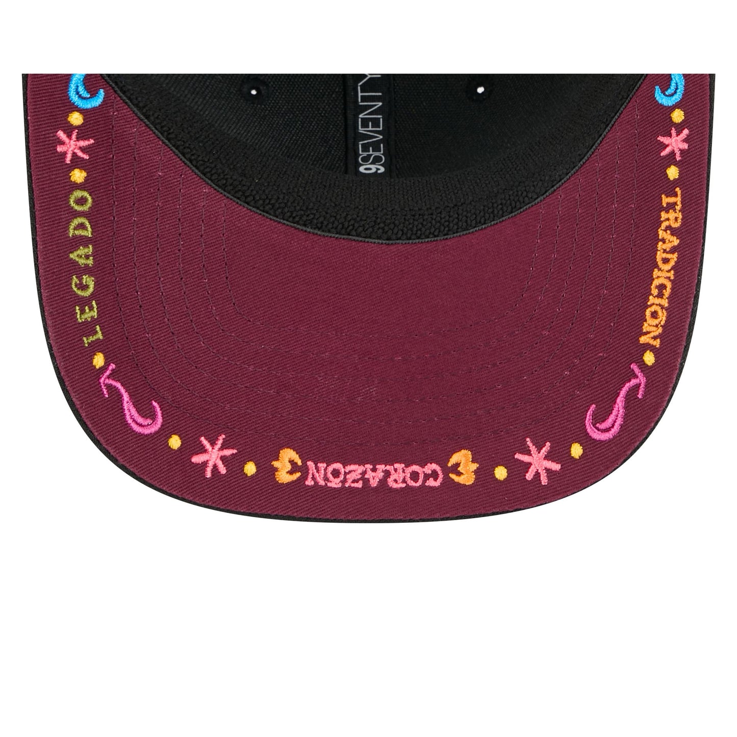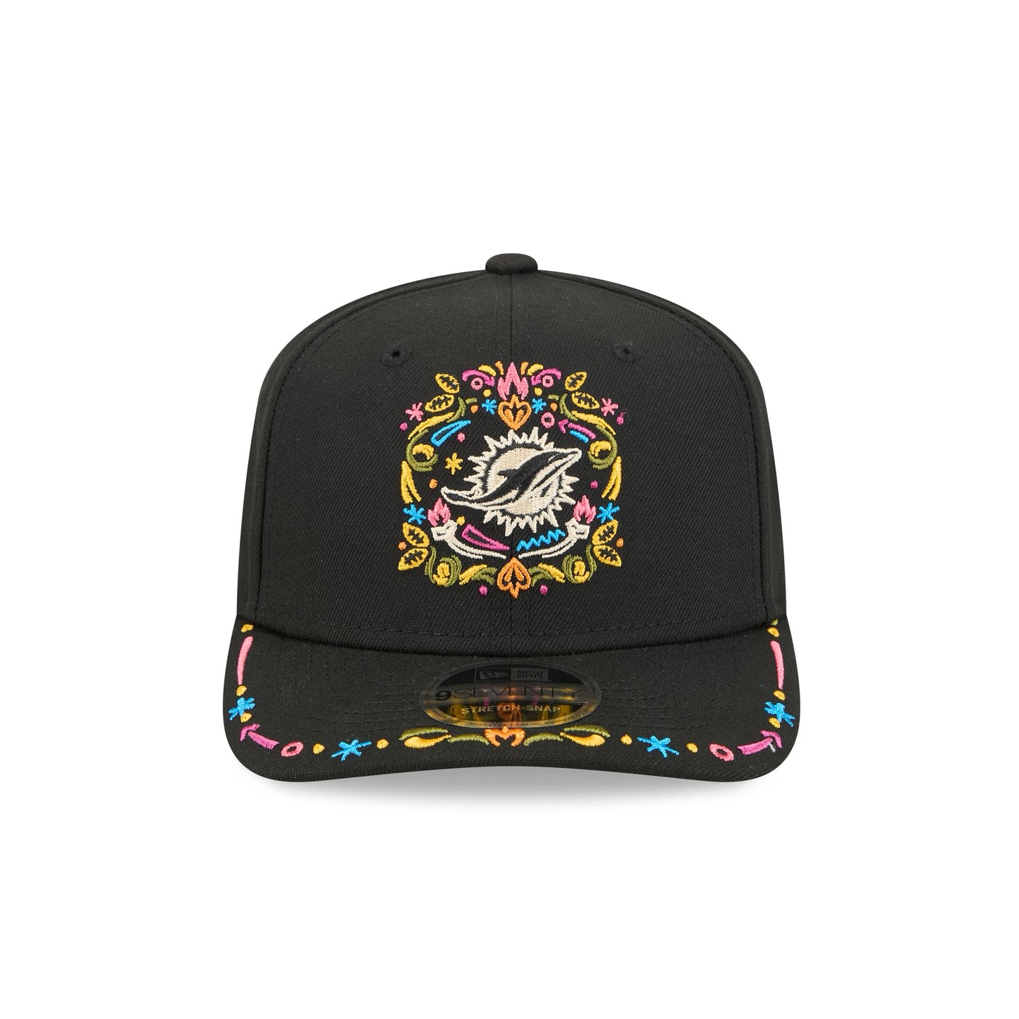 The Miami Dolphins Hasta La Muerte 9SEVENTY Stretch-Snap features an embroidered Dolphins logo and Day of the Dead design at the front panels. Additional details include design at the visor, and an undervisor that reads: Tradición, Corazón y Legado, meaning Tradition, Heart and Legacy. A matching NFL Shield is shown at the rear with an adjustable snapback closure.