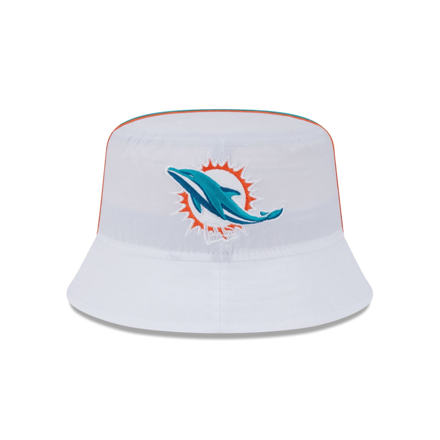 The Miami Dolphins Helmet Bucket Hat features an embroidered Dolphins helmet design throughout.