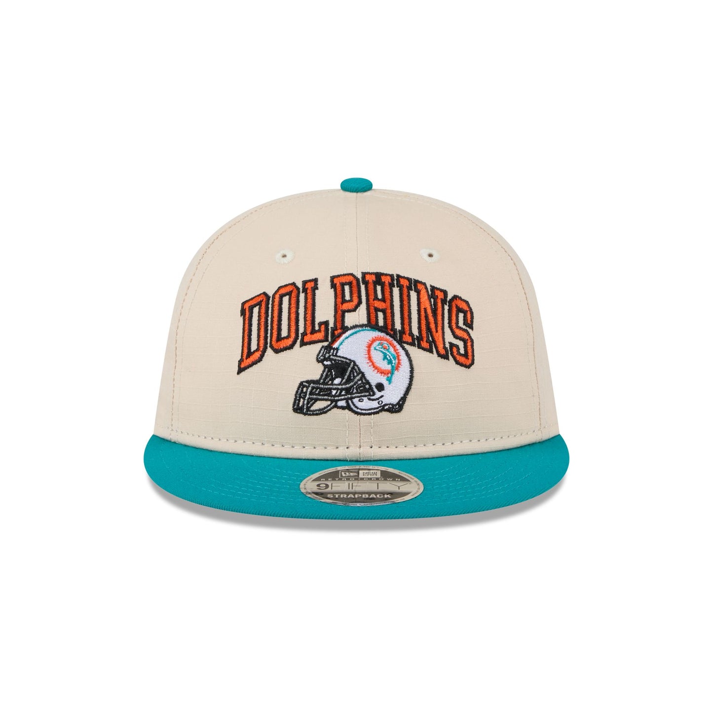 The Miami Dolphins Historic Helmet Retro Crown 9FIFTY Snapback features an embroidered Dolphins Historic helmet and wordmark at the front panels with a snapback closure at the rear and a gray undervisor.