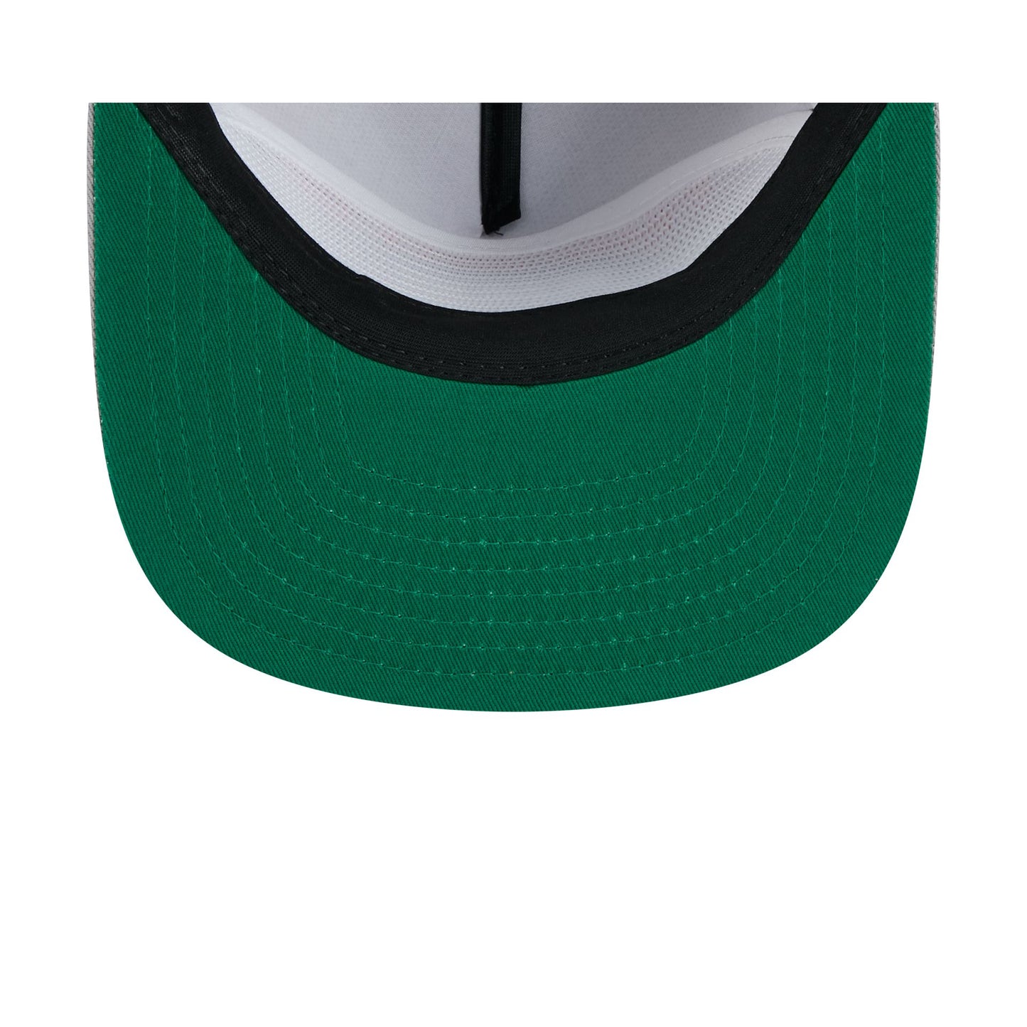The Miami Dolphins Vintage Gray Golfer features an embroidered "PROPERTY OF" Dolphins wordmark at the front panels with a team logo at the right-wear side and a rope at the visor. Additional details include a snapback closure at the rear and a green undervisor.