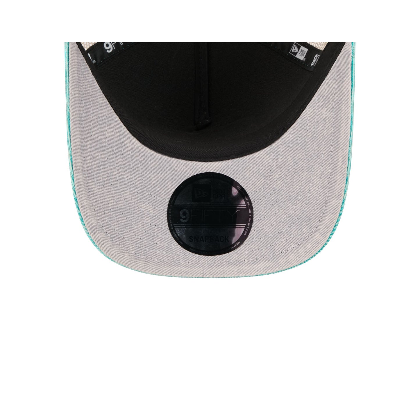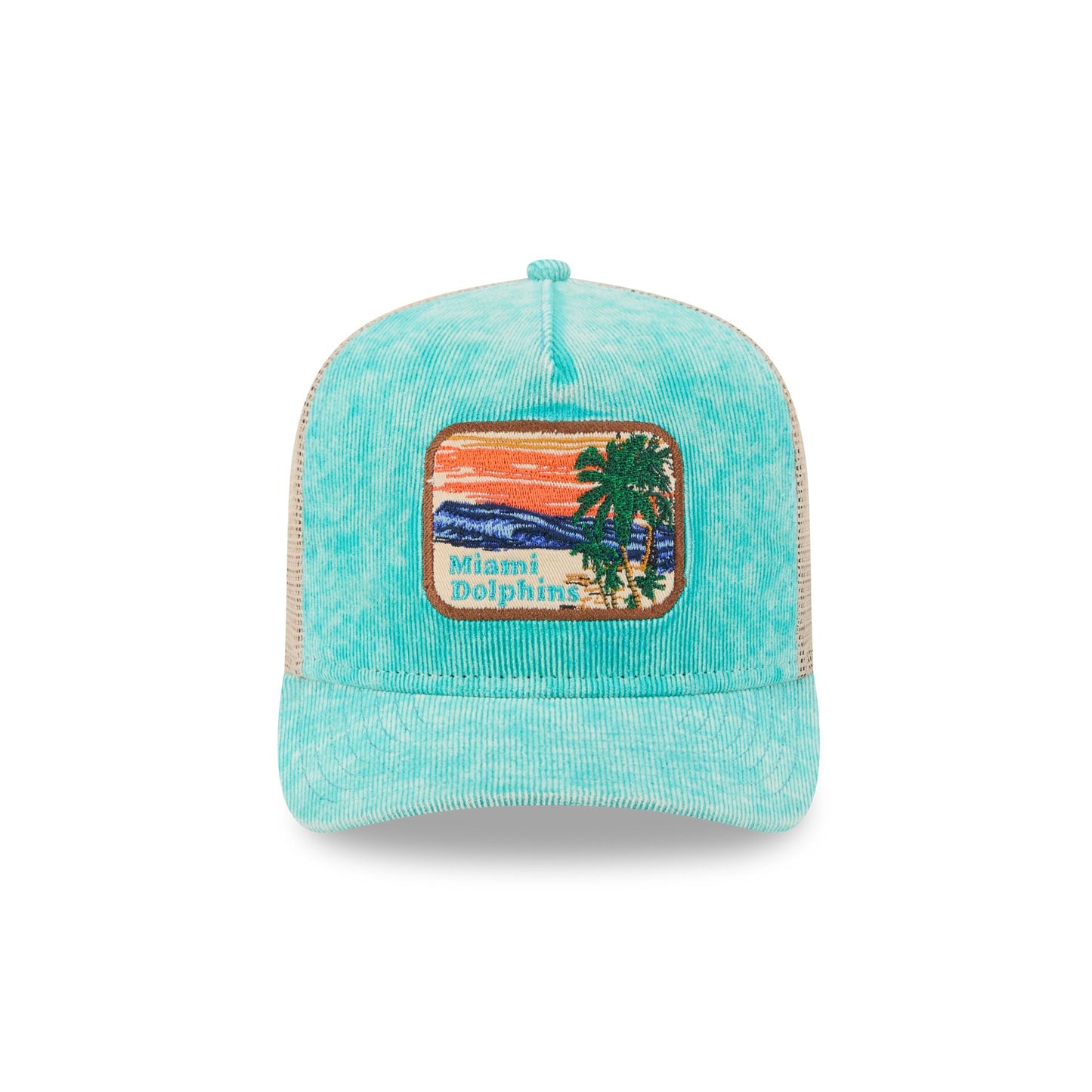 The Miami Dolphins Vintage Landscape 9FIFTY A-Frame Trucker features an embroidered Dolphins Vintage Landscape patch at the front panels with a team logo at the right-wear side. Additional details include an adjustable snapback closure at the rear and a gray undervisor.