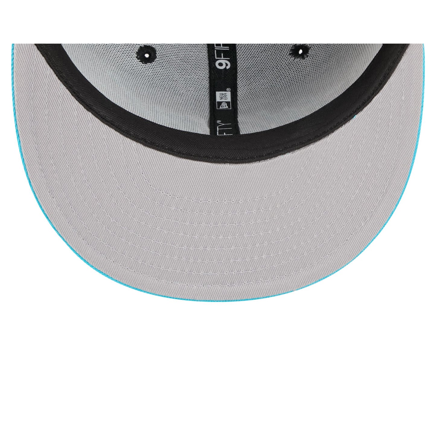 The Miami Heat 2025 City Edition 9FIFTY Snapback features an embroidered Heat City Edition logo at the front panels with a logo at the right-wear side. Additional details include the NBA Logoman above an adjustable snapback closure at the rear and a gray undervisor.