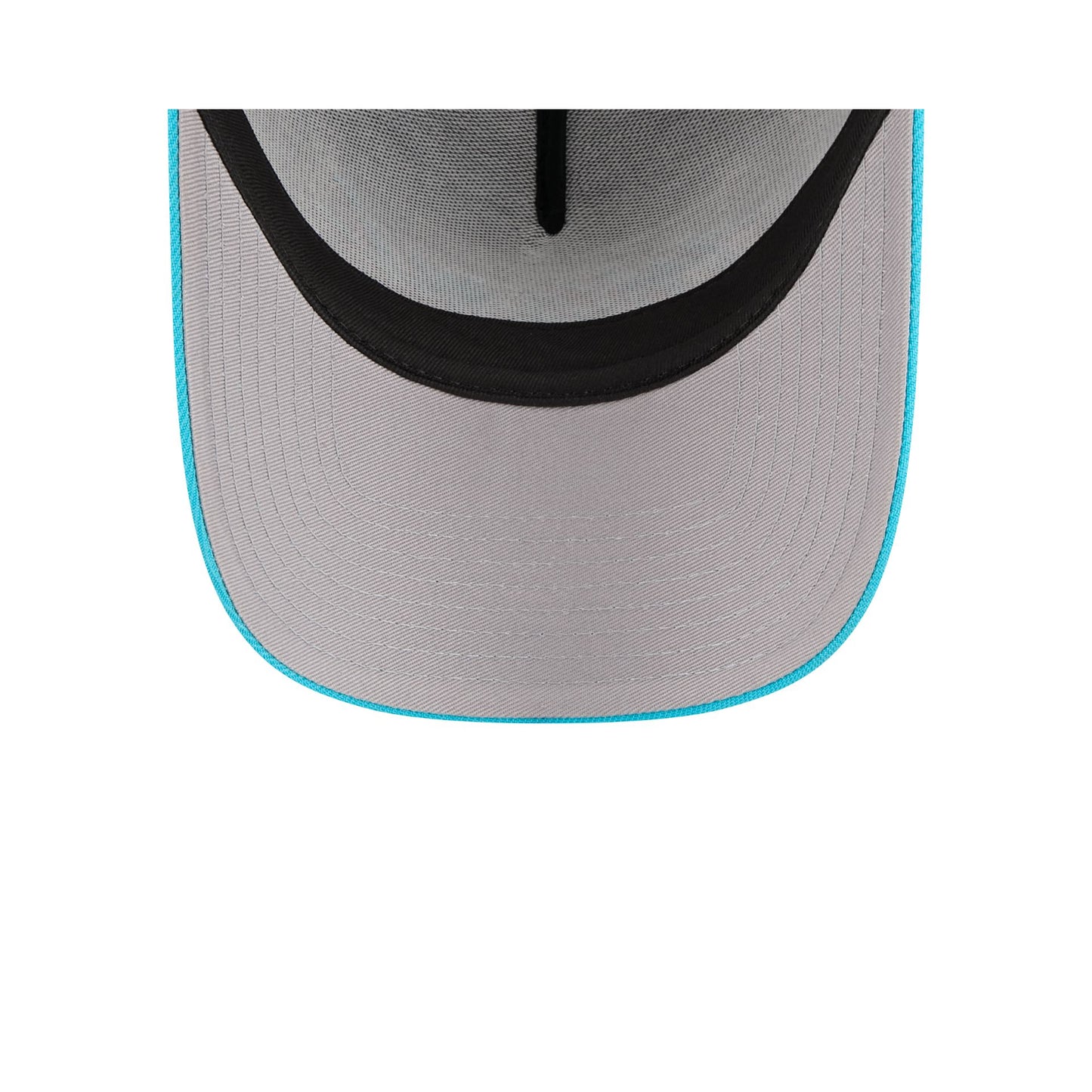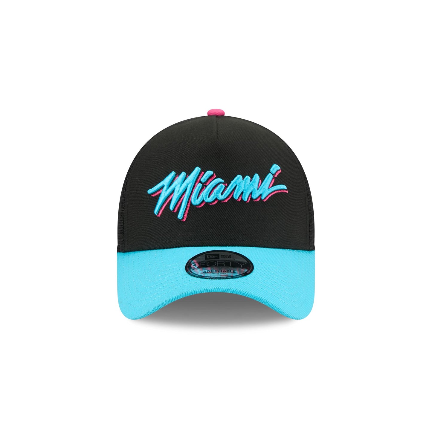 The Miami Heat 2025 City Edition 9FORTY A-Frame Trucker features an embroidered Heat City Edition logo at the front panels with a logo at the right-wear side. Additional details include the NBA Logoman above an adjustable snapback closure at a mesh rear and a gray undervisor.