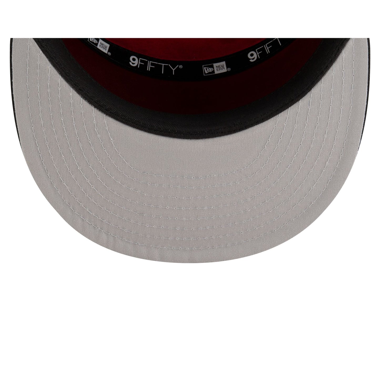 The Miami Heat 2025 Tip-Off Split Panel 9FIFTY Snapback features an embroidered Heat logo at the front panels against a pinstripe jersey fabrication with the NBA Logoman at the right-wear side. Additional details include an adjustable snapback closure at the rear and a gray undervisor.
