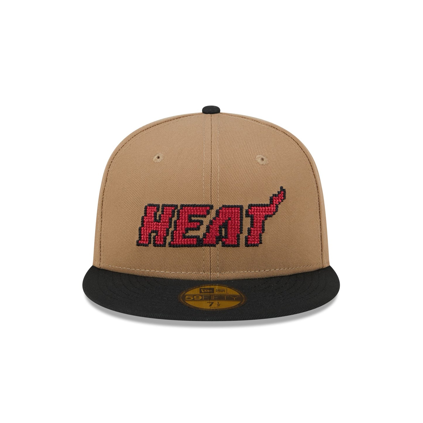 The Miami Heat Classic 8-Bit Wordmark 59FIFTY Fitted Cap featured an embroidered Heat 8-bit stitch wordmark at the front panels. Additional details include a team wordmark with a matching MLB Batterman logo at the rear and a gray undervisor.