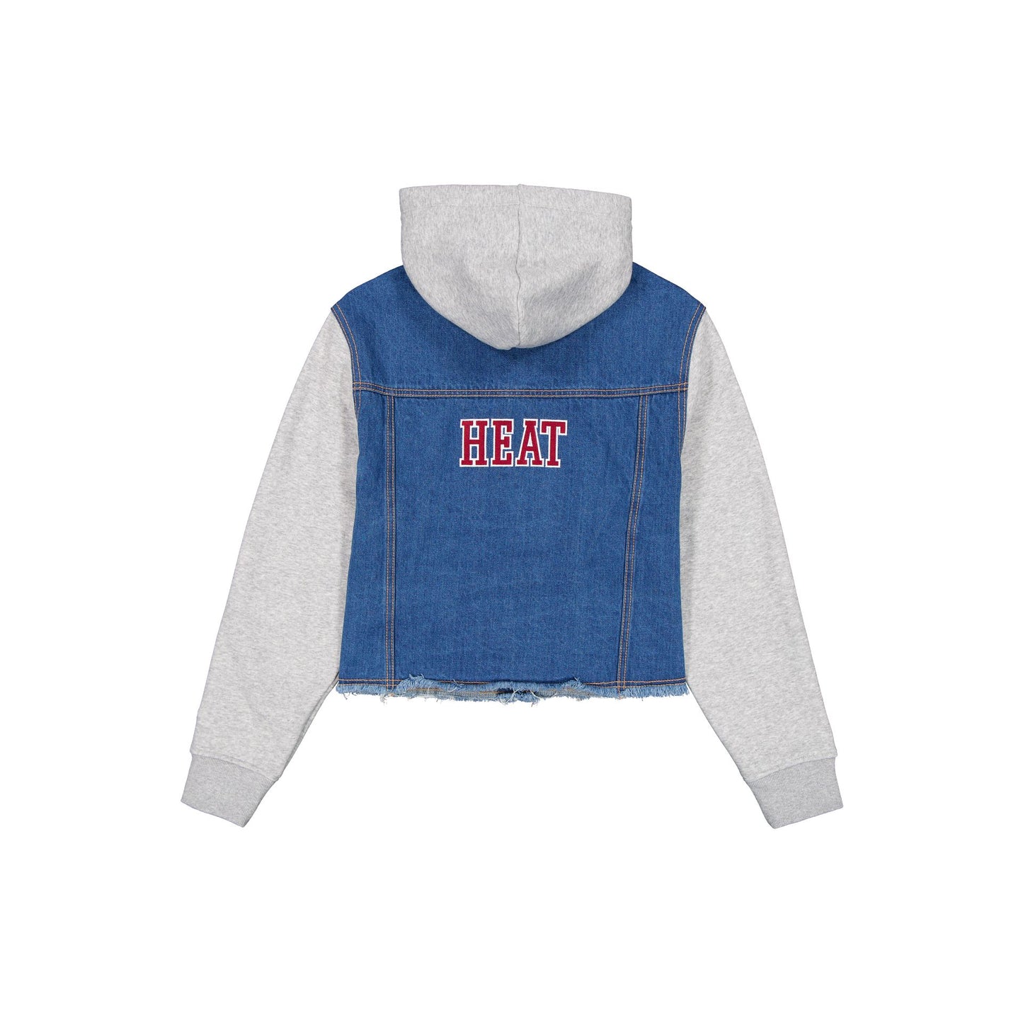 The Miami Heat Game Day Women's Denim Jacket features an embroidered Heat logo at the left chest with a faux leather jock tag at the left hip. Additional details include an embroidered wordmark at the rear, front pockets, a button closure, and a hood.
