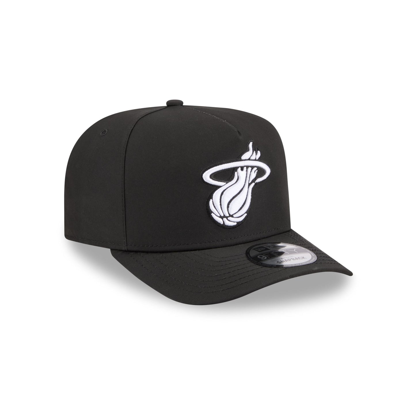 The Miami Heat GORE-TEX Black 9FIFTY A-Frame Snapback features an embroidered white Heat logo at the front panels with a metallic sheen silicone New Era Flag logo and GORE-TEX logo at the left-wear side. Additional details include an adjustable snapback closure at the rear, a gray undervisor, and a polyester fabrication throughout the cap. It is waterproof, breathable, and lightweight.