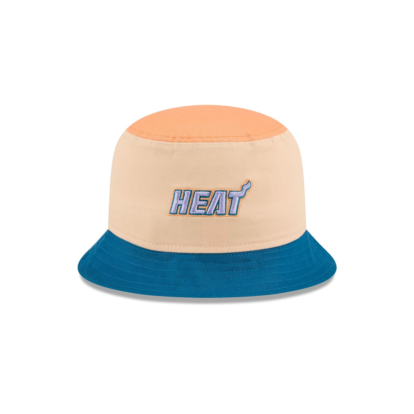 The Miami Heat Mango Mocha Bucket Hat features an embroidered Heat logo at the front panels with a wordmark at the rear.
