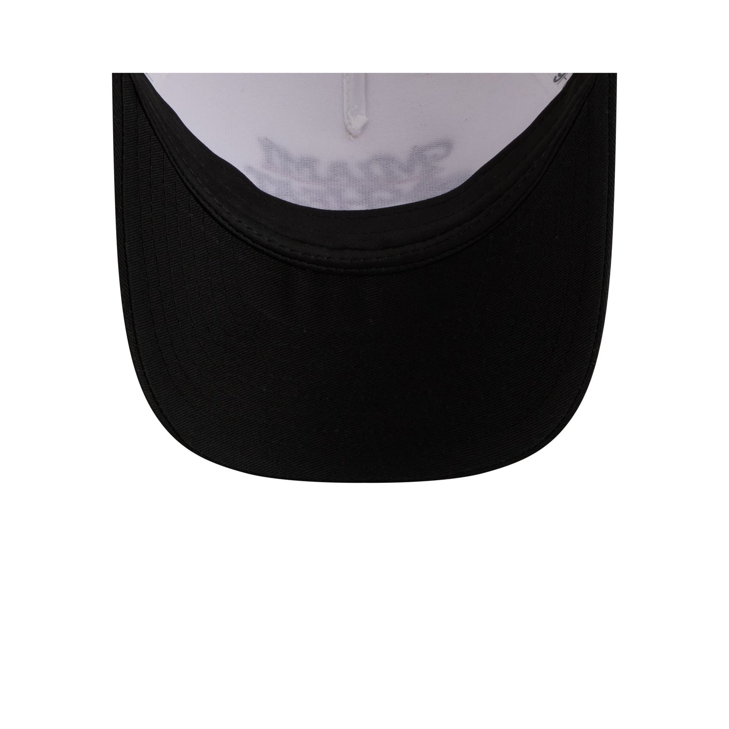 The Miami Heat Retro Chrome Women's White 9FORTY M-Crown A-Frame Trucker features an embroidered Heat graphic against a plush front panel with an adjustable snapback closure at a mesh rear and a team color undervisor.
