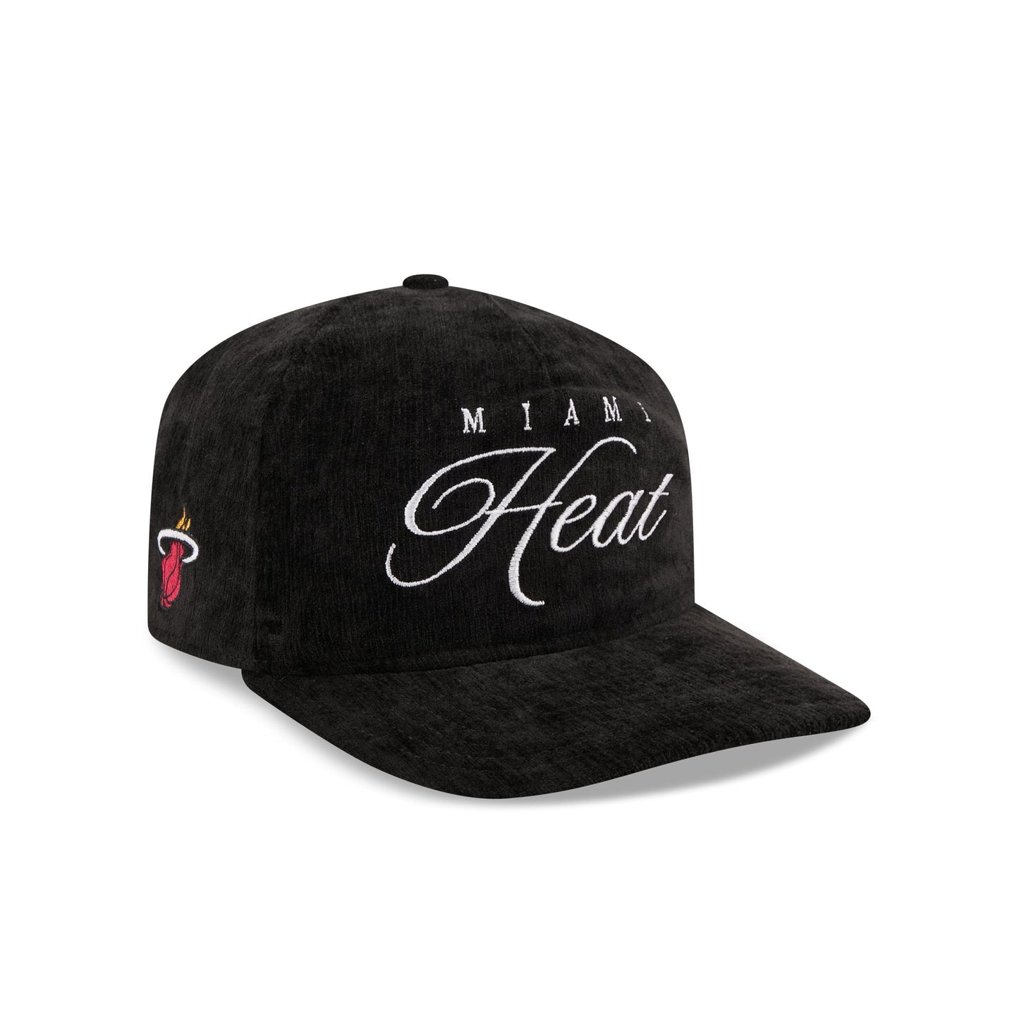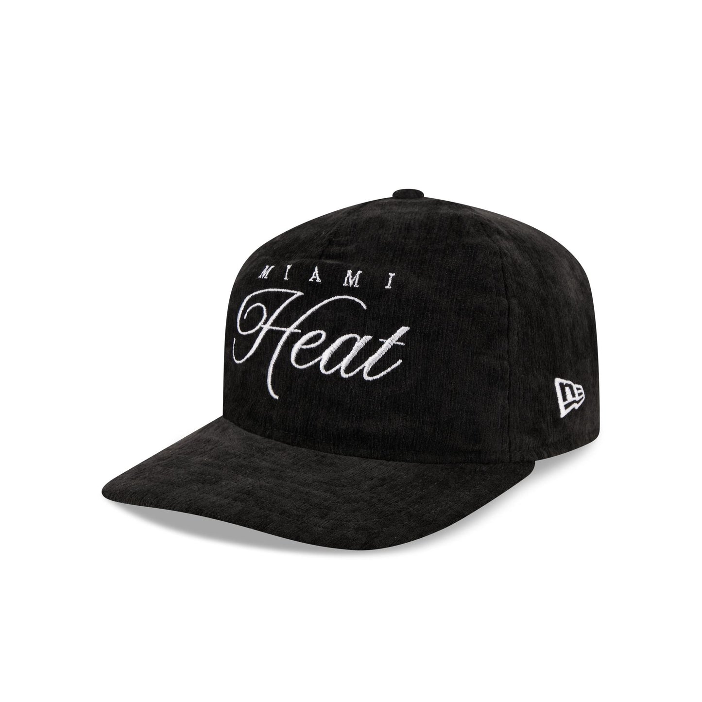 The Miami Heat Velvet Team Script 19TWENTY Adjustable Cap features an embroidered Heat wordmark script at the front panels with a team logo at the right-wear side. Additional details include an adjustable snapback closure at the rear and a gray undervisor.