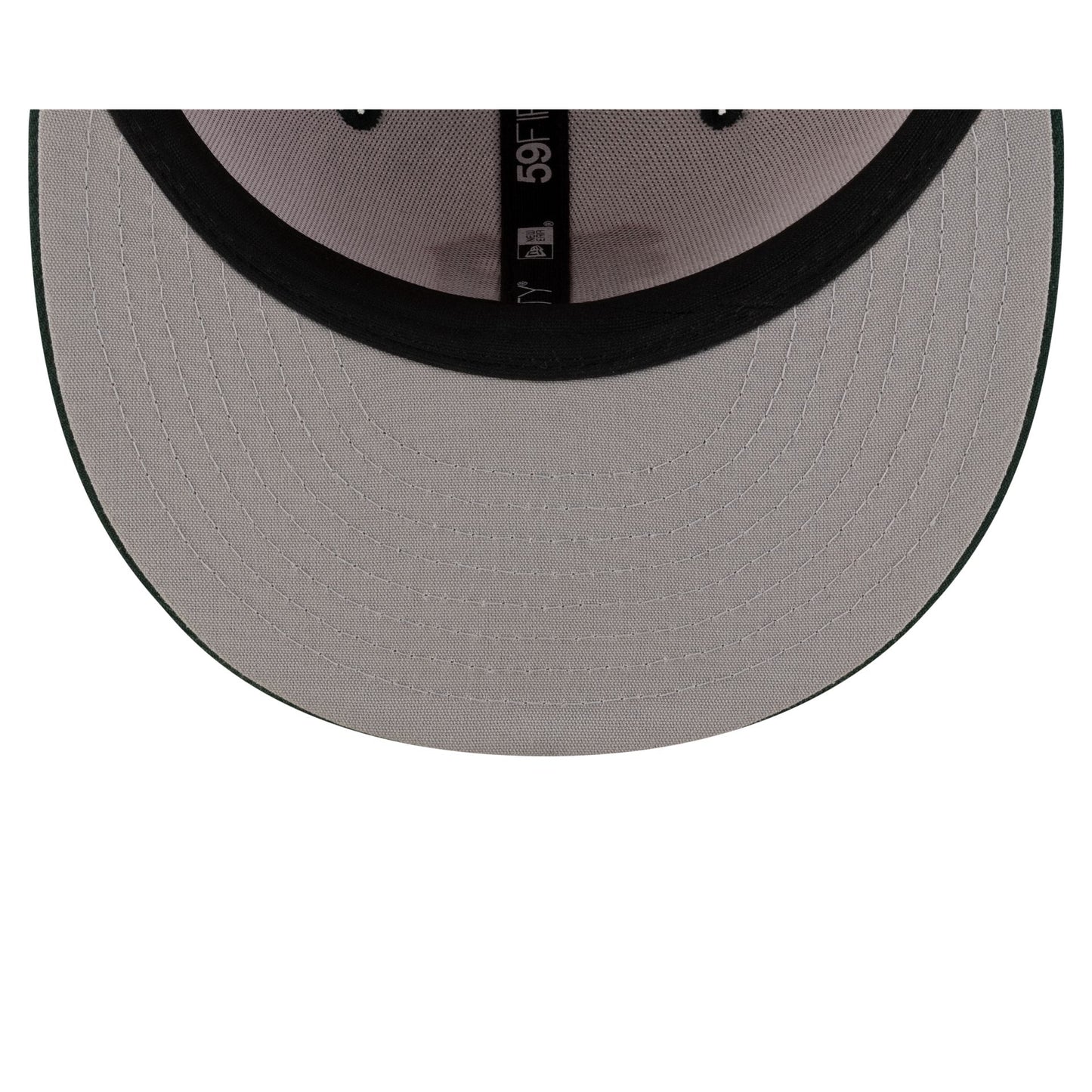 The Official On-Field cap for the University of Miami Hurricanes baseball, the Chrome Block 59FIFTY Fitted Cap features an embroidered Hurricanes logo at the front panels with a gray undervisor.