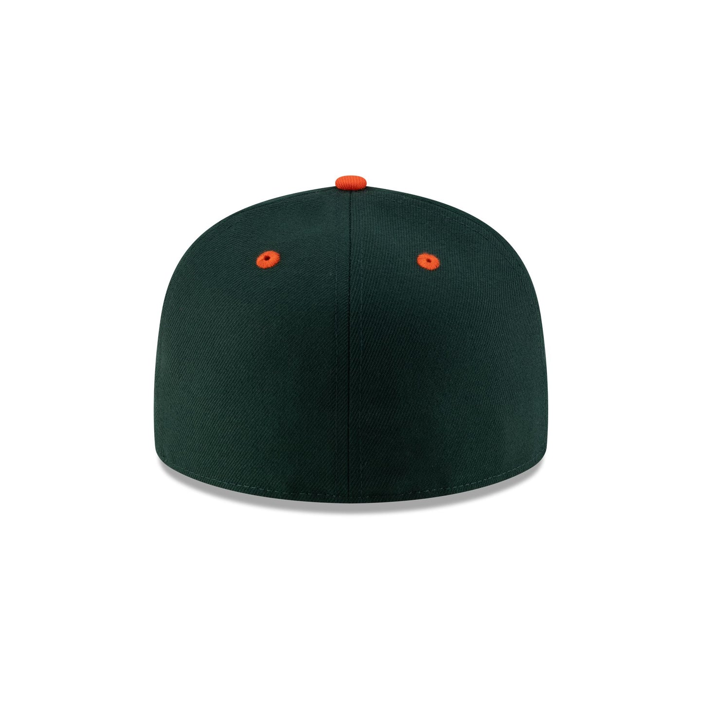 The Official On-Field cap for the University of Miami Hurricanes baseball, the Dark Green 59FIFTY Fitted Cap features an embroidered Hurricanes logo at the front panels with a gray undervisor.