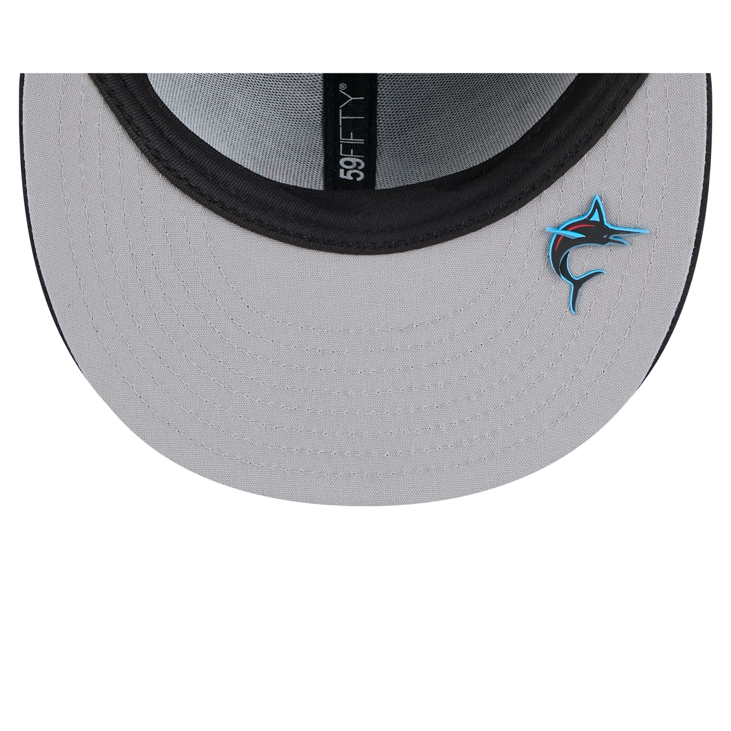 The Miami Marlins 2025 Clubhouse Alt 59FIFTY Fitted Cap features an embroidered Marlins alternate logo at the front panels with a matching MLB Batterman logo at the rear. Additional details include a dashmark mesh fabrication and a silicone logo on a gray undervisor.