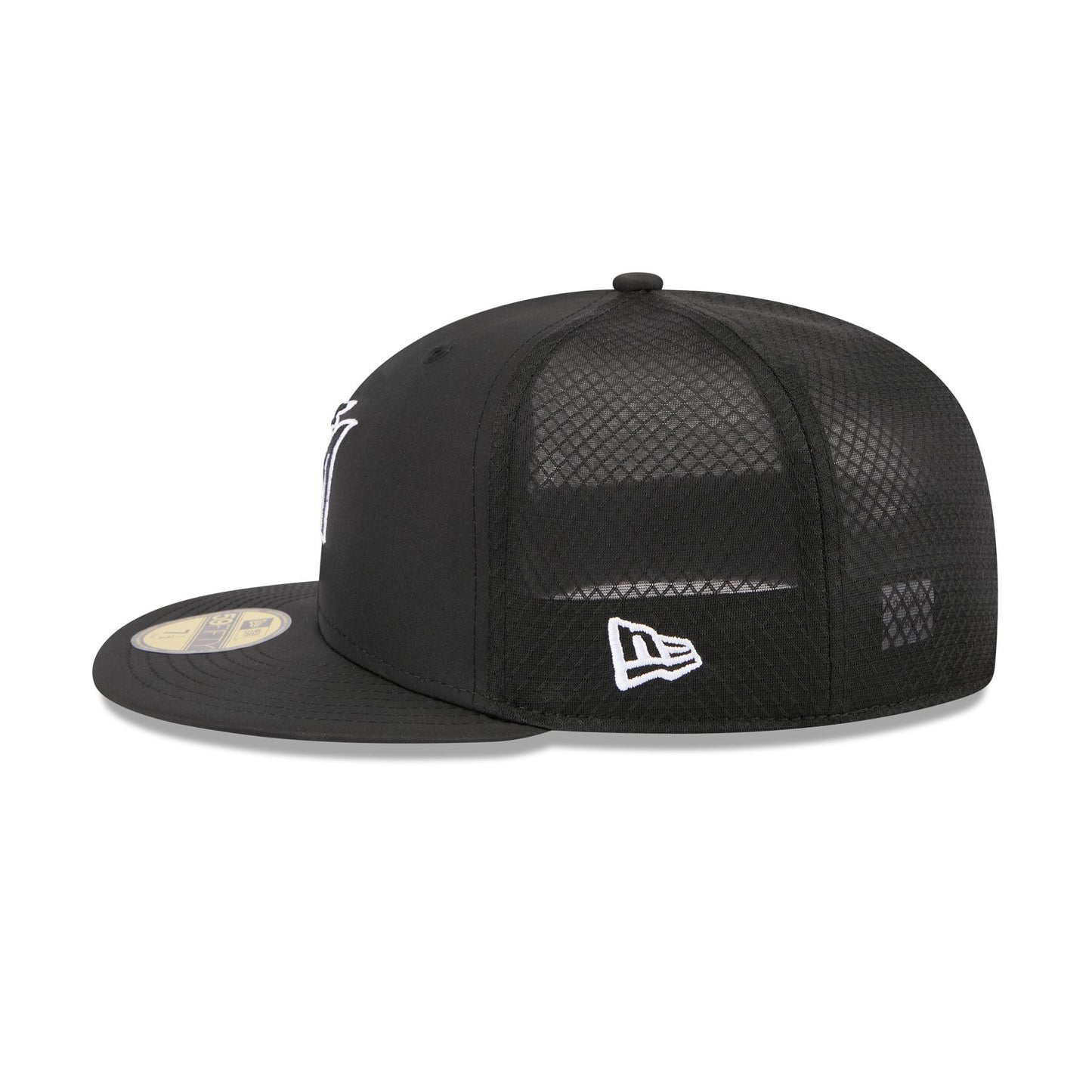 The Miami Marlins 2026 Batting Practice Fan Pack 59FIFTY Fitted Cap features an embroidered Marlins logo at the front panels with the MLB Batterman logo at a diamond mesh rear.