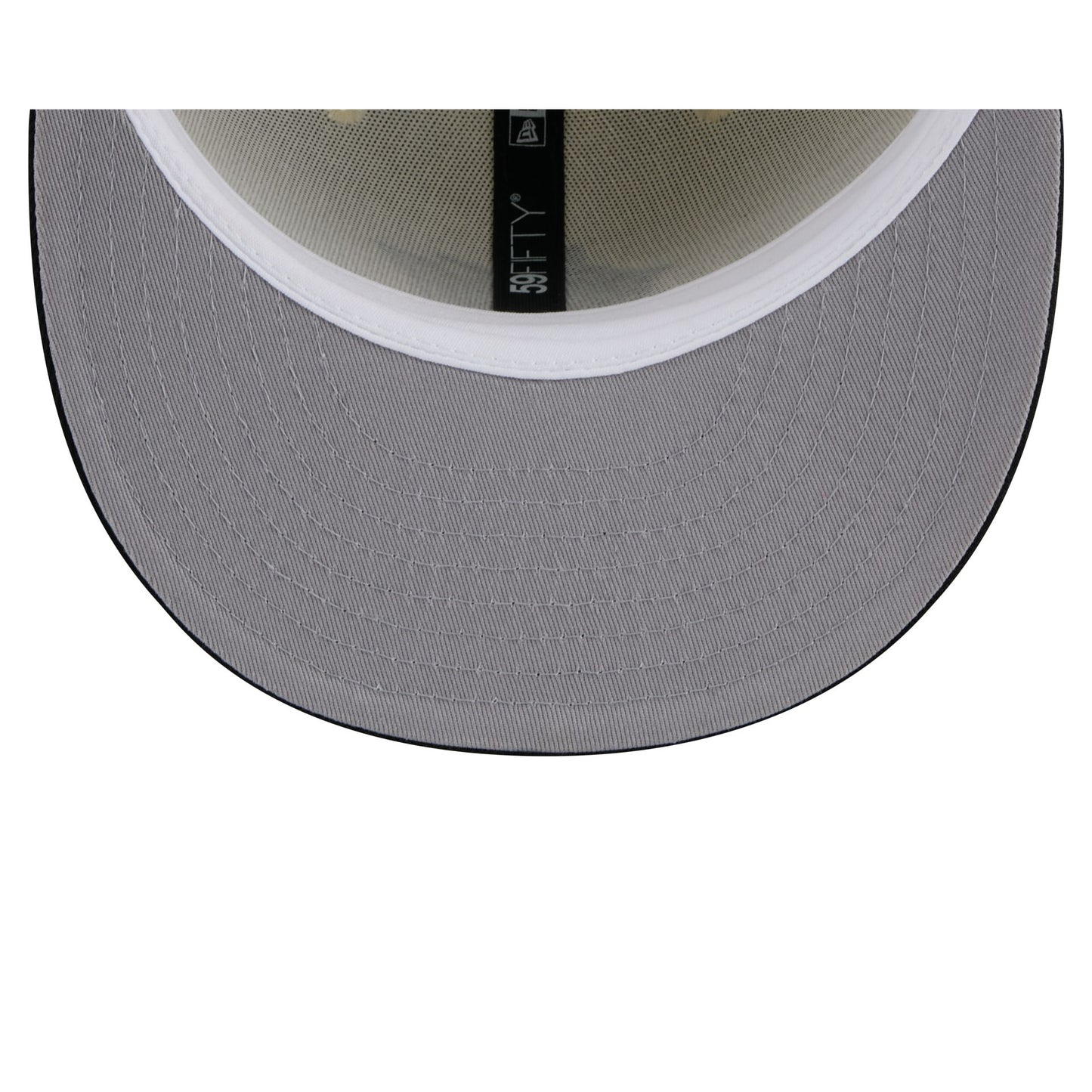The Miami Marlins Chrome 59FIFTY Fitted Cap features an embroidered Marlins logo at the front panels with a matching MLB Batterman logo at the rear, a black visor, and a gray undervisor.