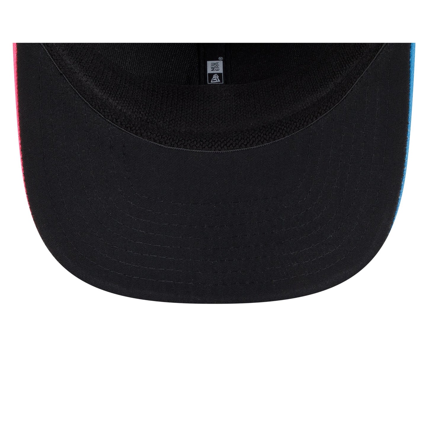 The Miami Marlins City Connect 9SEVENTY Stretch-Snap features an embroidered Marlins 305 logo at the front panels with an MLB Batterman logo above a snapback closure at the rear and a black undervisor.
