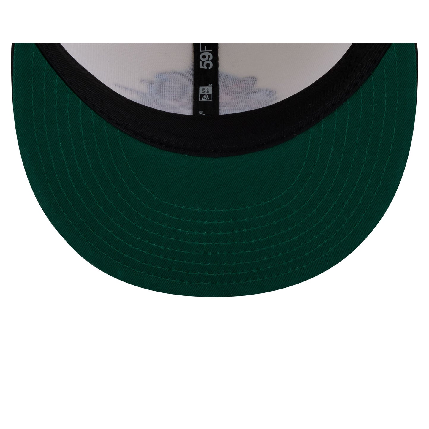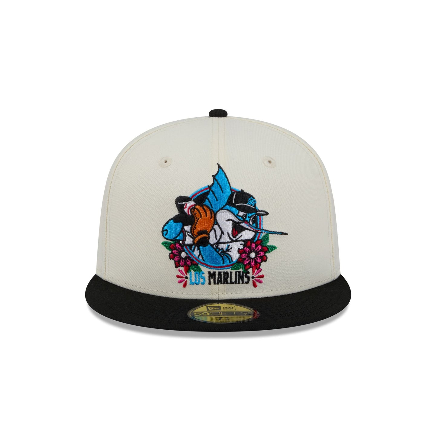 The Miami Marlins Day of the Dead Sugar Skull Mascot 59FIFTY Fitted Cap features an embroidered Marlins Mascot with flowers at the front panels with a skeletal mascot at the right-wear side. Additional details include the MLB Batterman logo at the rear and a green undervisor.