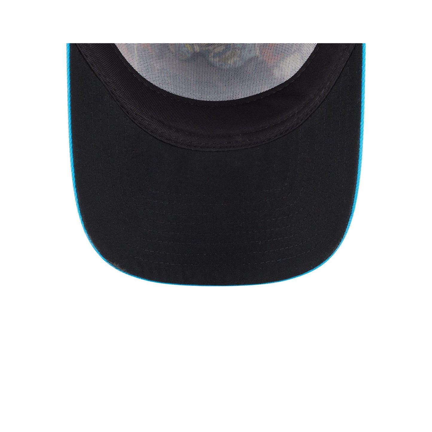 The Miami Marlins Diamond Hero Edition 9FORTY A-Frame Snapback features an embroidered Marlins onomatopoeia pop wordmark at the front panels with baseball comic book prints at the front and back panel. Additional details include a ZOOM! wordmark at the left-wear side, the MLB Batterman logo above a snapback closure at the rear, and a black undervisor.