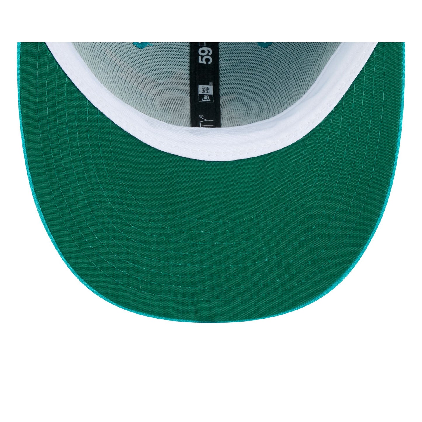 The Miami Marlins Hall of Fame 2025 Low Profile 59FIFTY Fitted Cap features an embroidered Marlins Cooperstown logo at the front panels with a matching MLB Batterman logo at the rear, a National Baseball Hall of Fame patch at the right-wear side, and a green undervisor.