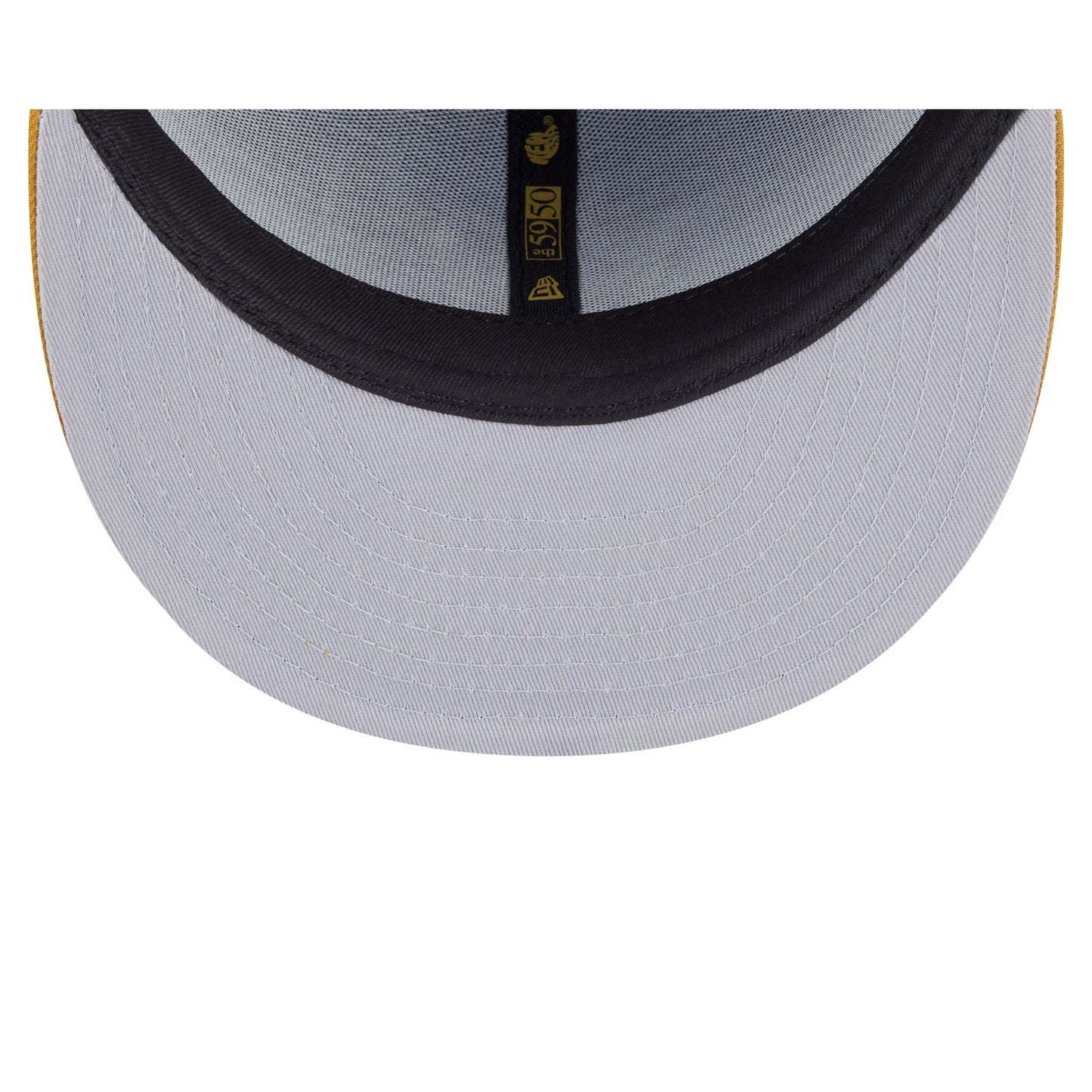 The Miami Marlins Metallic Gold Logo 59FIFTY Fitted Cap features an embroidered gold Marlins logo at the front panels with a matching MLB Batterman logo at the rear. Additional details include a gold visor and a gray undervisor.