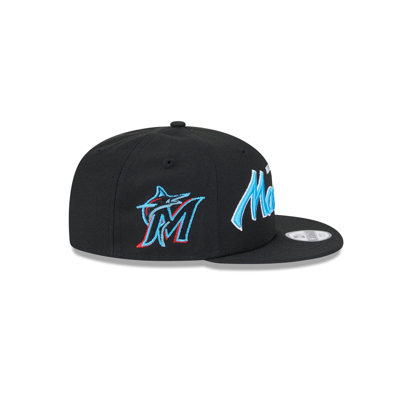 The Miami Marlins Kids 9FIFTY Snapback Hat features an embroidered Marlins wordmark at the front panels with a matching team logo at the right-wear side. Additional details include a gray undervisor and a snapback closure at the rear.