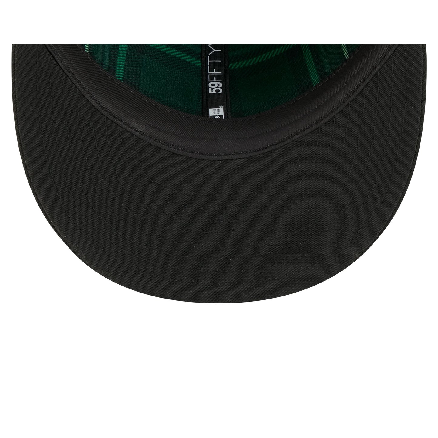 The Miami Marlins St. Patrick's Day 2026 59FIFTY Fitted Cap features a green and gold embroidered Marlins logo at the front panels with a matching MLB Batterman logo at the rear and a mini shamrock at the top right. Additional details include a team wordmark over a metallic green shamrock baseball diamond patch at the right-wear side with a green plaid interior fabrication at the front panels.