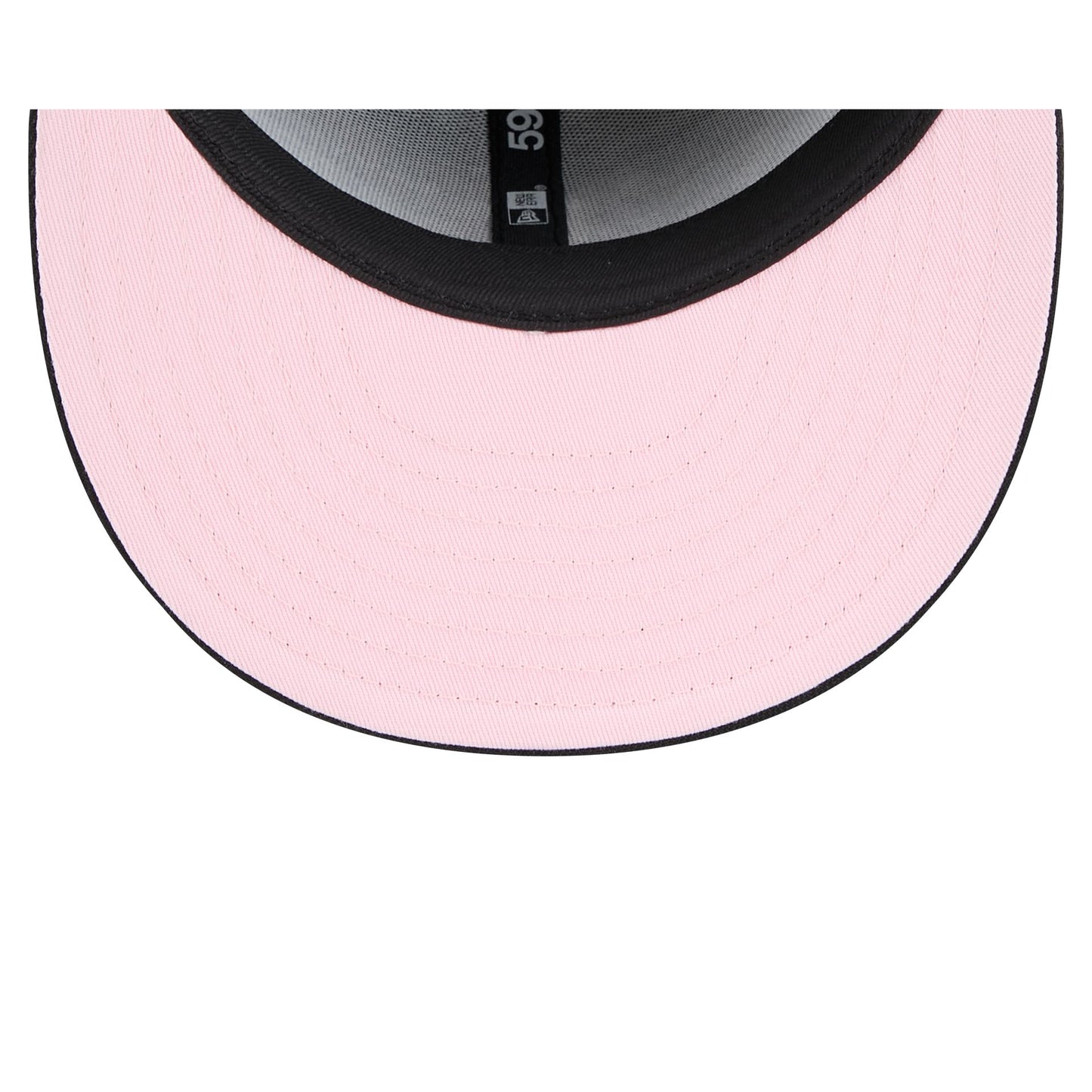 The Miami Marlins Tonal Koi 59FIFTY Fitted Cap features an embroidered Marlins Cooperstown logo at the front panels against a Koi pond embroidery throughout the cap. Additional details include a pink MLB Batterman logo at the rear and a matching undervisor.