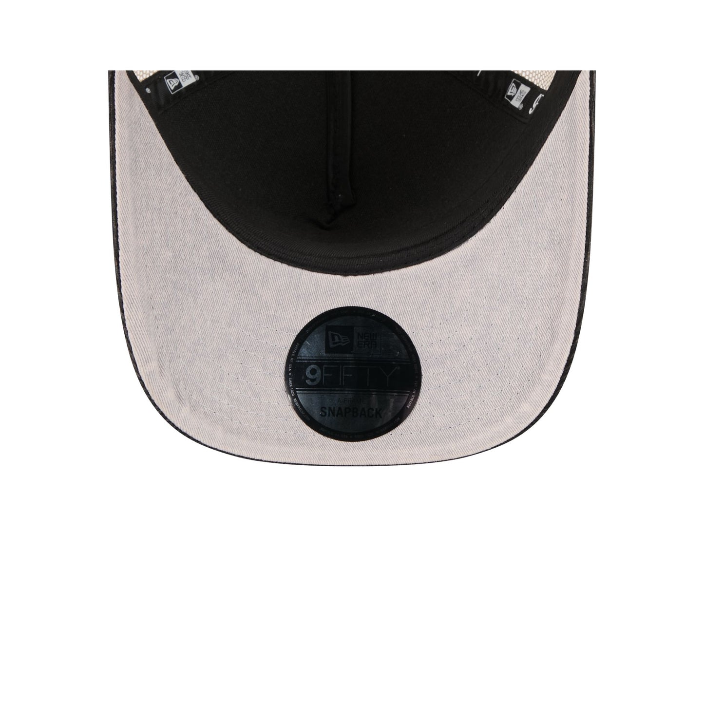 The Miami Marlins Vintage Landscape 9FIFTY A-Frame Trucker features an embroidered Marlins Vintage Landscape patch at the front panels with a Cooperstown team logo at the right-wear side. Additional details include an adjustable snapback closure at the rear and a gray undervisor.