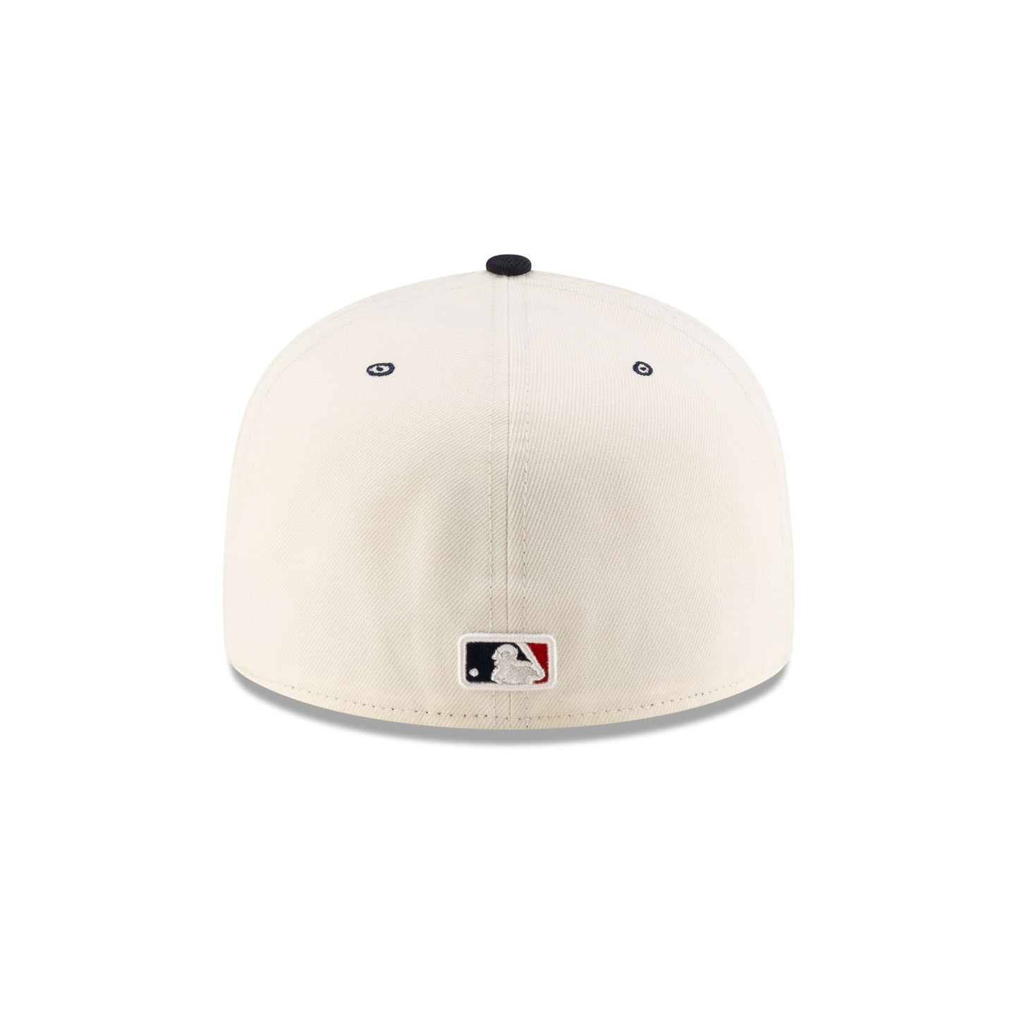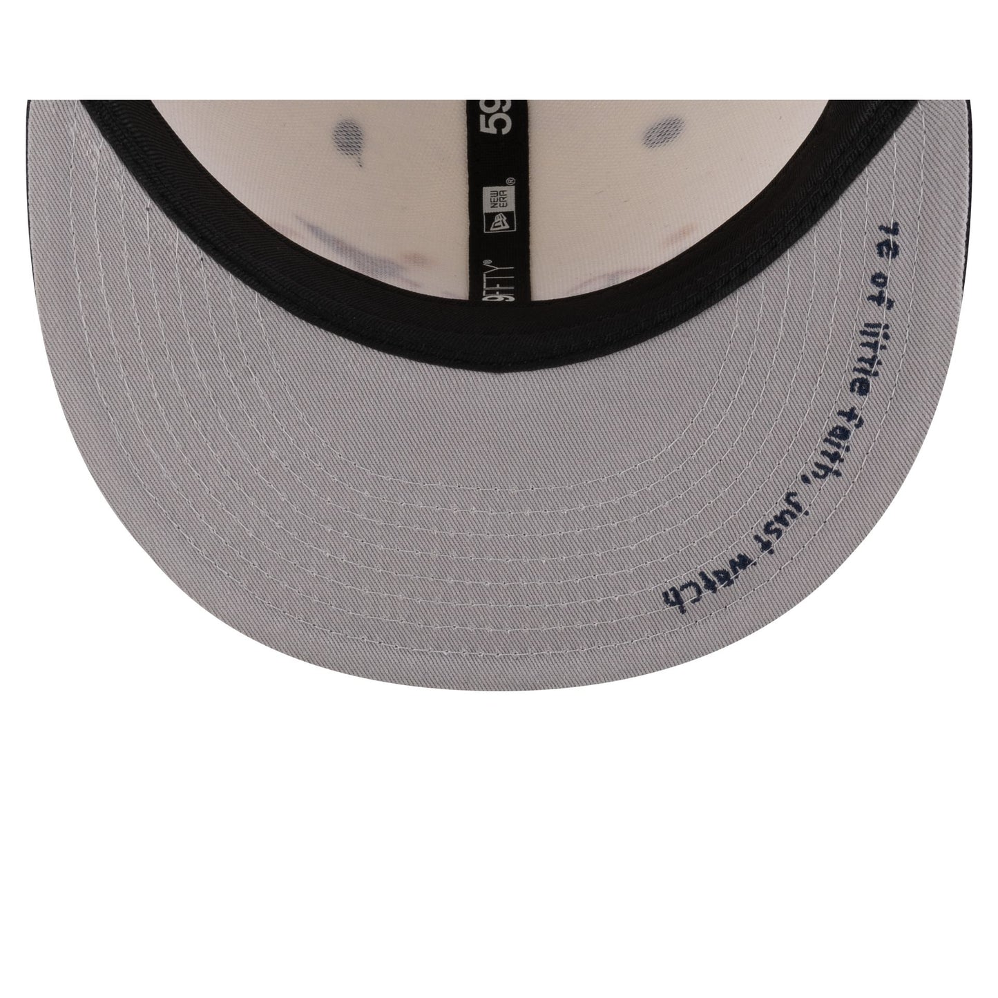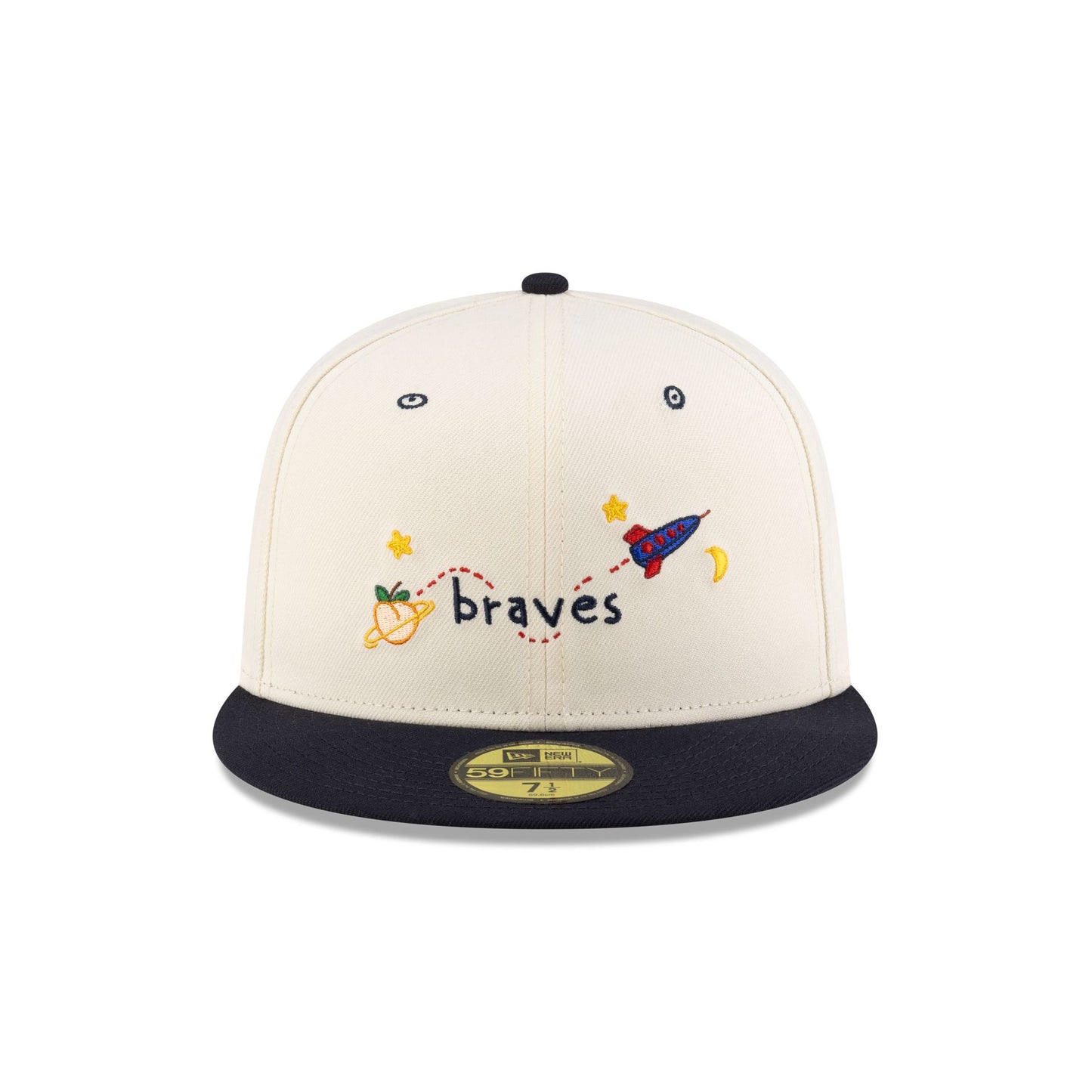 The Micah Johnson x Atlanta Braves 59FIFTY Fitted Cap features an embroidered Braves wordmark and city artwork at the front panels with a matching MLB Batterman logo at the rear. Additional details include a AKU astronaut helmet embroidered at the right-wear side with a team color visor and a "ye of little faith, just watch" quote at the gray undervisor.