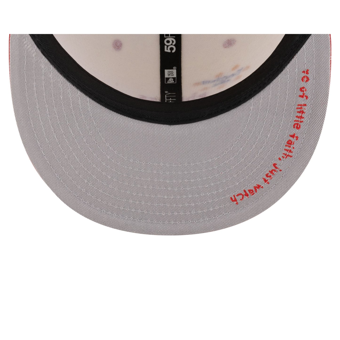 The Micah Johnson x Philadelphia Phillies 59FIFTY Fitted Cap features an embroidered Phillies wordmark and city artwork at the front panels with a matching MLB Batterman logo at the rear. Additional details include a AKU astronaut helmet embroidered at the right-wear side with a team color visor and a "ye of little faith, just watch" quote at the gray undervisor.