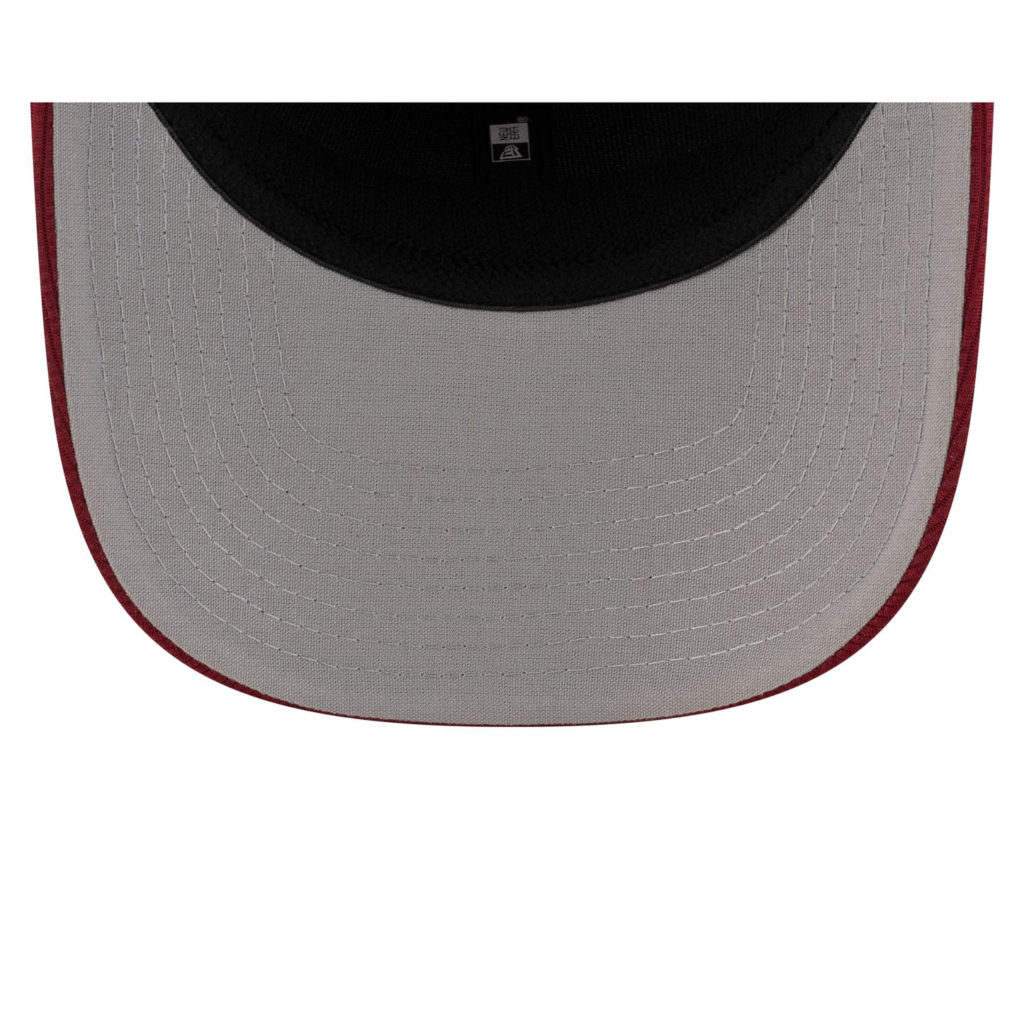 The Michigan Panthers Red 9SEVENTY Stretch-Snap features an embroidered Panthers logo at the front panels with the New Era Flag at the left. Additional details include a UFL logo above a snapback closure at the rear and a gray undervisor.