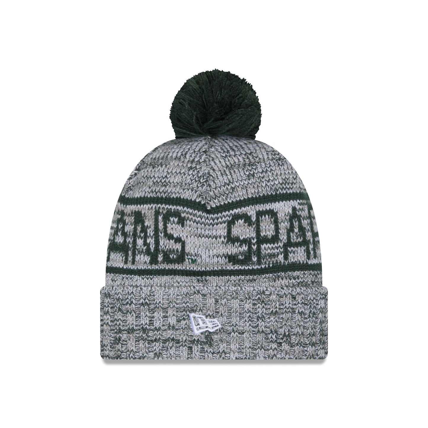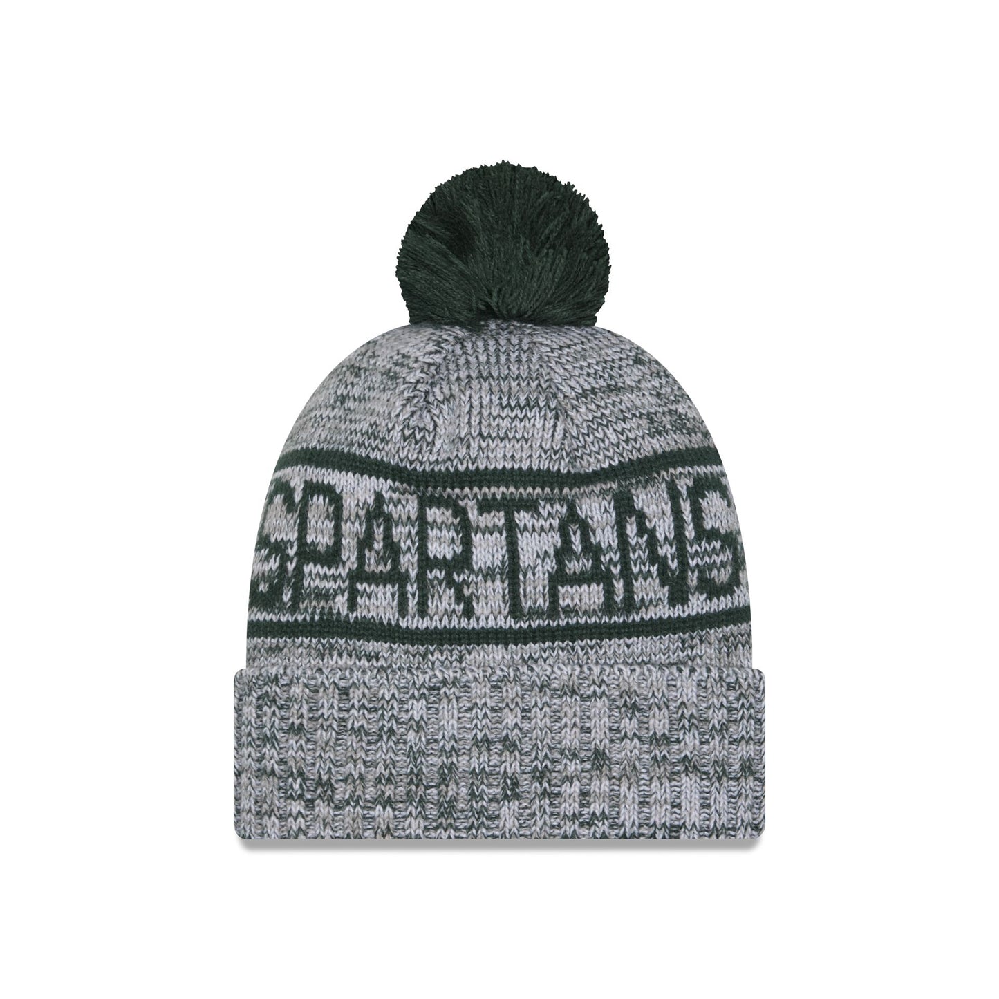 The Michigan State Spartans Cold Weather Pom Knit features a sewn-down silicone Spartans logo patch at the front cuff with a New Era Flag at the left-wear side. Additional details include a team wordmark across the crown, a one-time removeable pom, and a fleece lining.