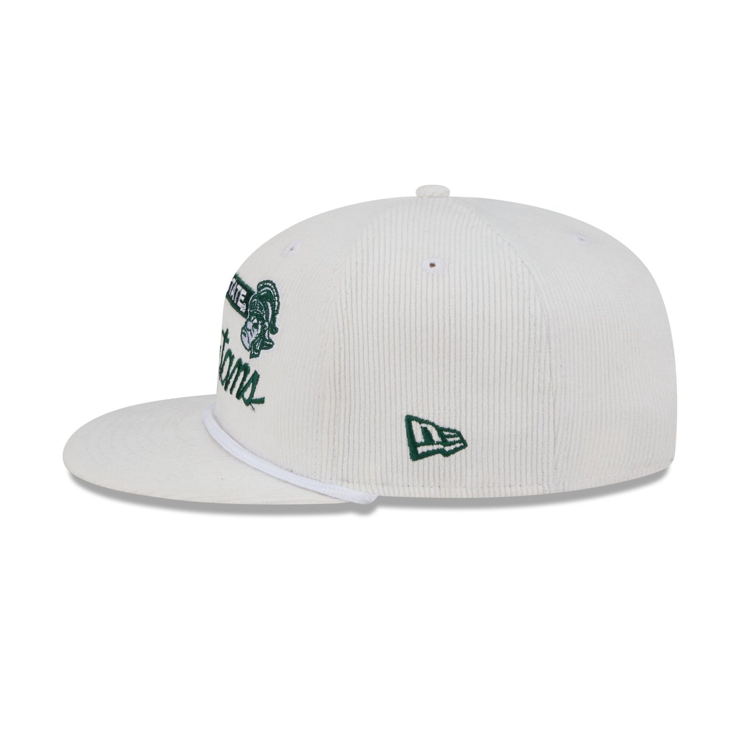 The Michigan State Spartans College Vault Corduroy Rope 9FIFTY Snapback features an embroidered Spartans College Vault graphic at the front panels with a corduroy fabrication throughout. Additional details include a rope at the visor, an adjustable snapback closure at the rear, and a gray undervisor.