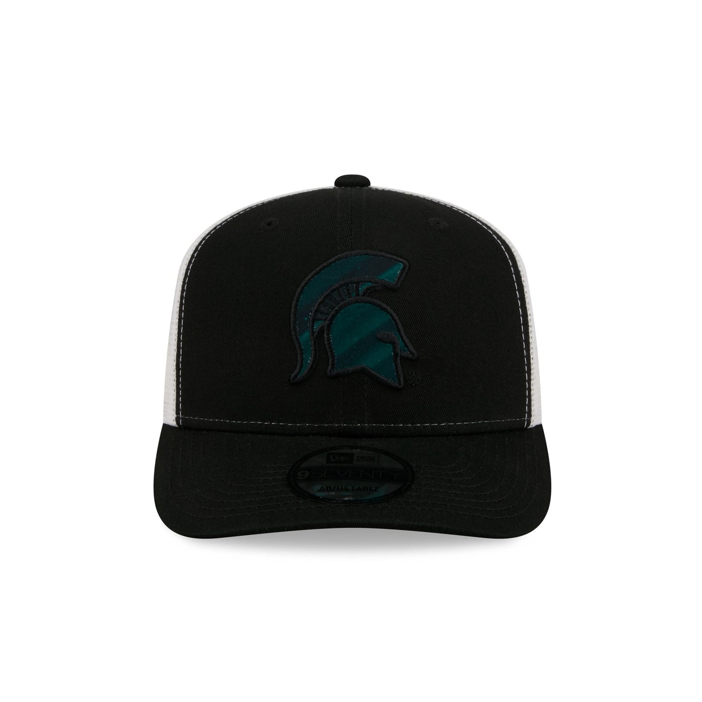 The Michigan State Spartans Collegiate Black 9SEVENTY Trucker features an embroidered Spartans logo at the front panels with an adjustable stretch-snap closure at the rear and red patterned undervisor.