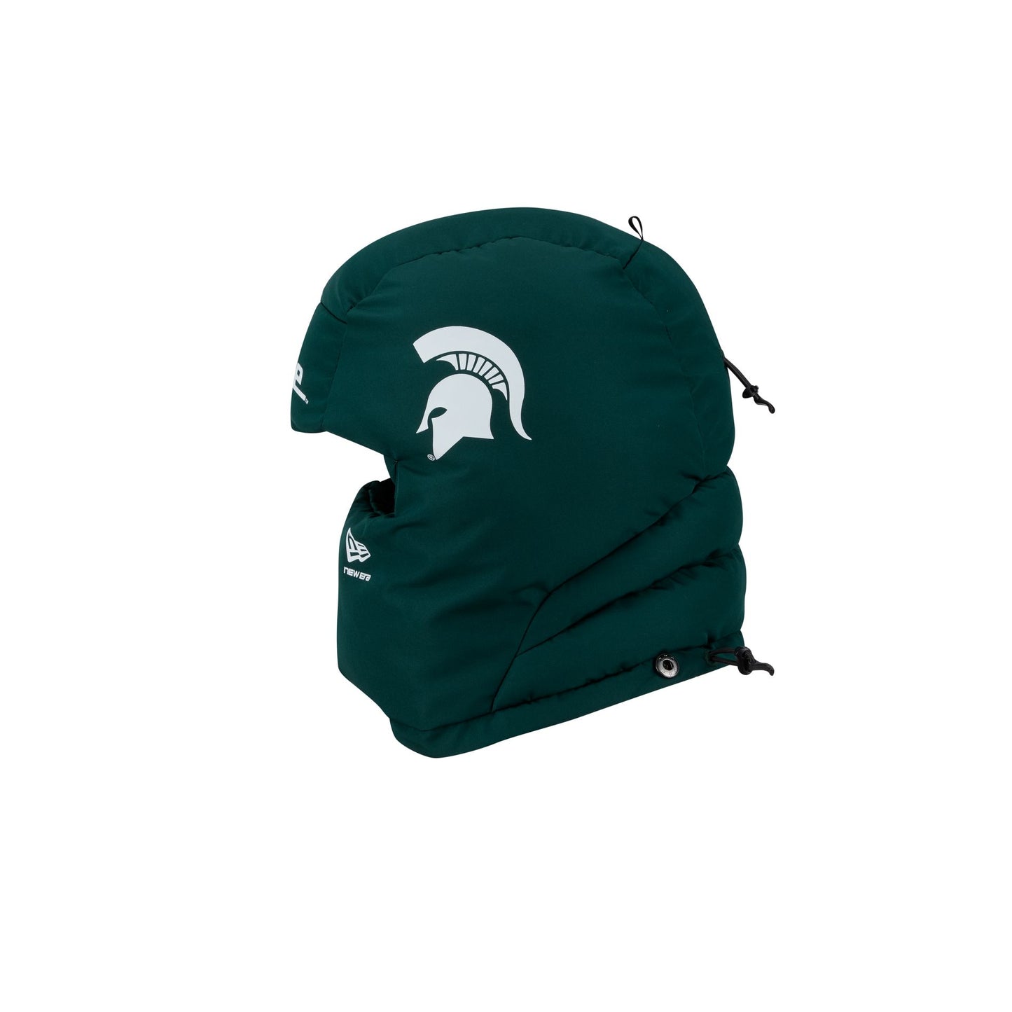 The Michigan State Spartans Helmet Puffer Hood features an embroidered Spartans wordmark at the front with a helmet design at each side. Additional details include an insulated filling with adjustable drawstrings at the back of the head and neck. The puffer helmet has a 4 snap-button closure at the right.