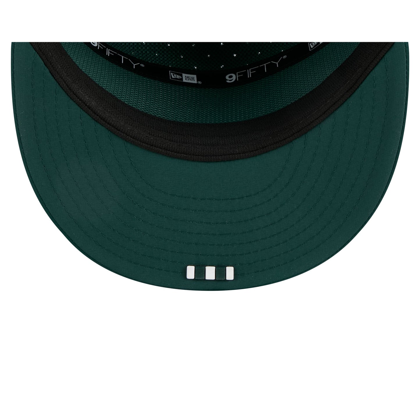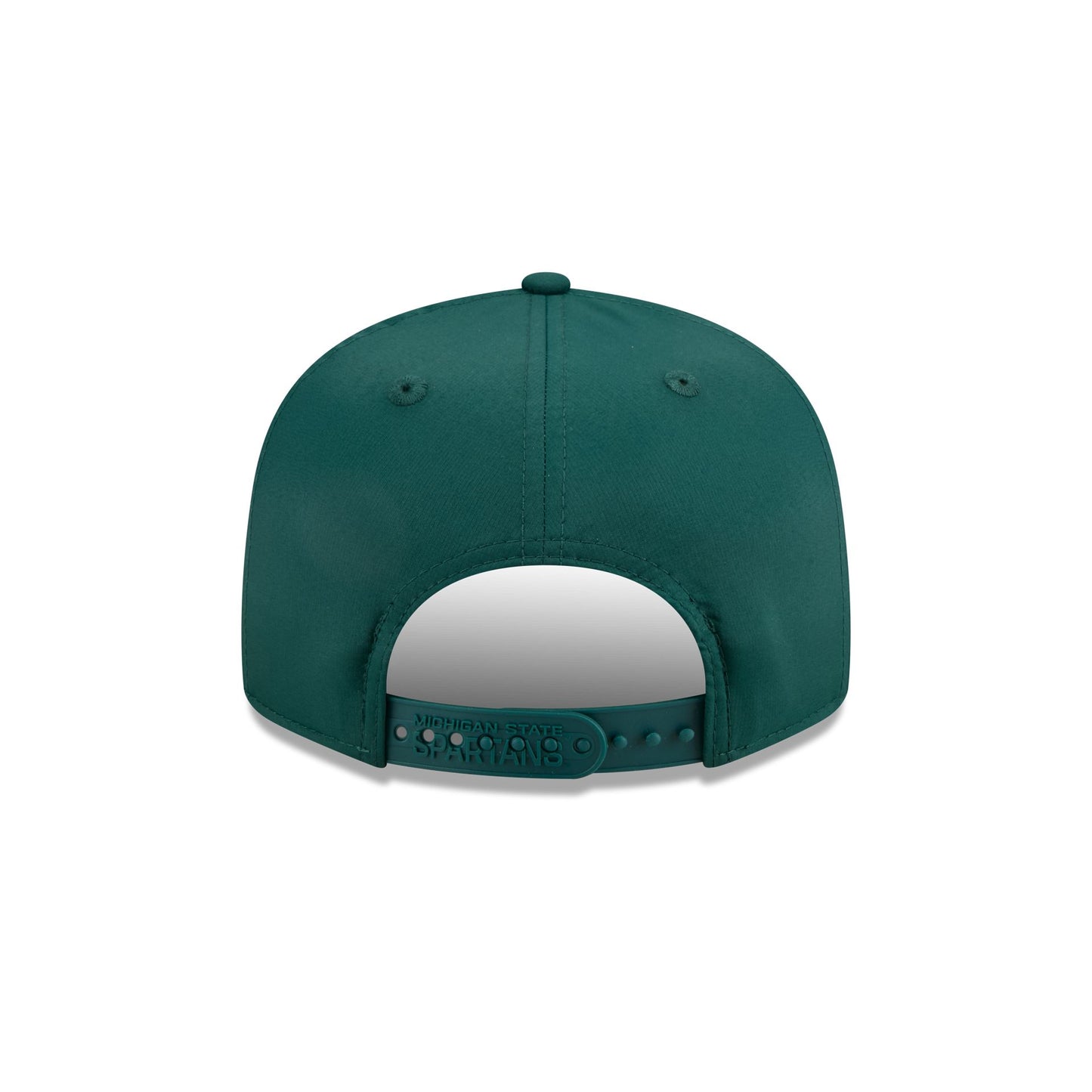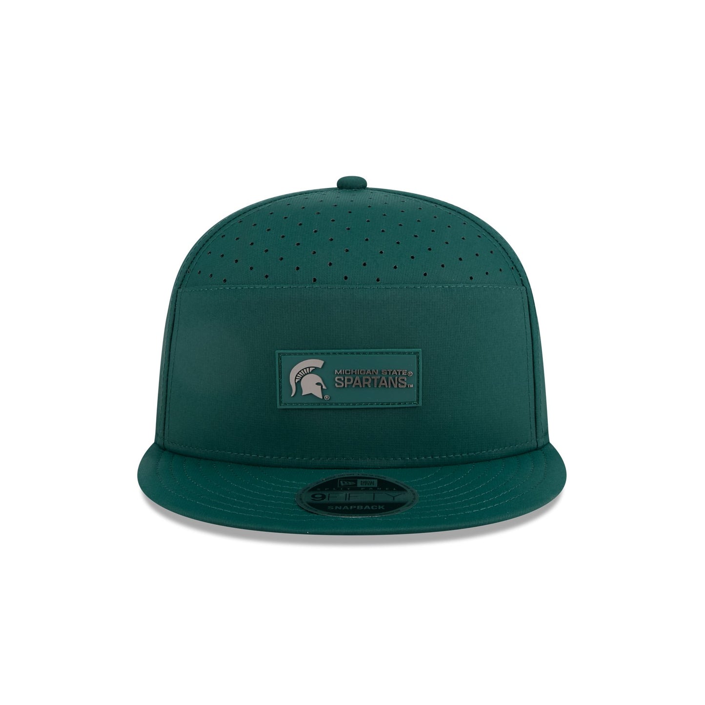 The Michigan State Spartans Hot Weather Split Panel 9FIFTY Snapback features a sewn-down silicone Spartans logo patch at the front panels with a split-crown construction featuring water-repellent quill tech fabrication. Additional details include a team wordmark at a soft silicone snapback closure at the rear with a quick-dry cushioned sweatband to absorb moisture and team color silicone transfer details at the undervisor.