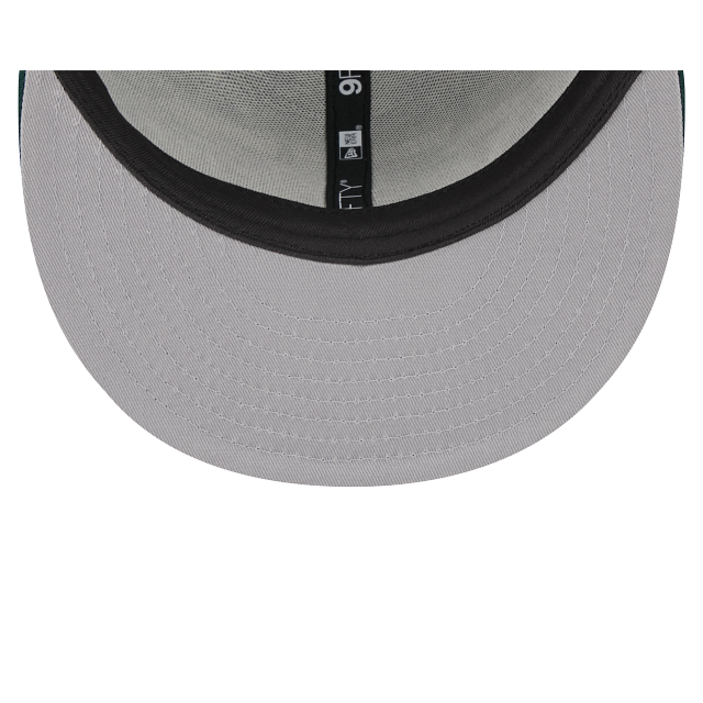 The Michigan State Spartans Script Green 9FIFTY Snapback features an embroidered Spartans script at the front panels with a team logo at the right-wear side. Additional details include a snapback closure at the rear and a gray undervisor.