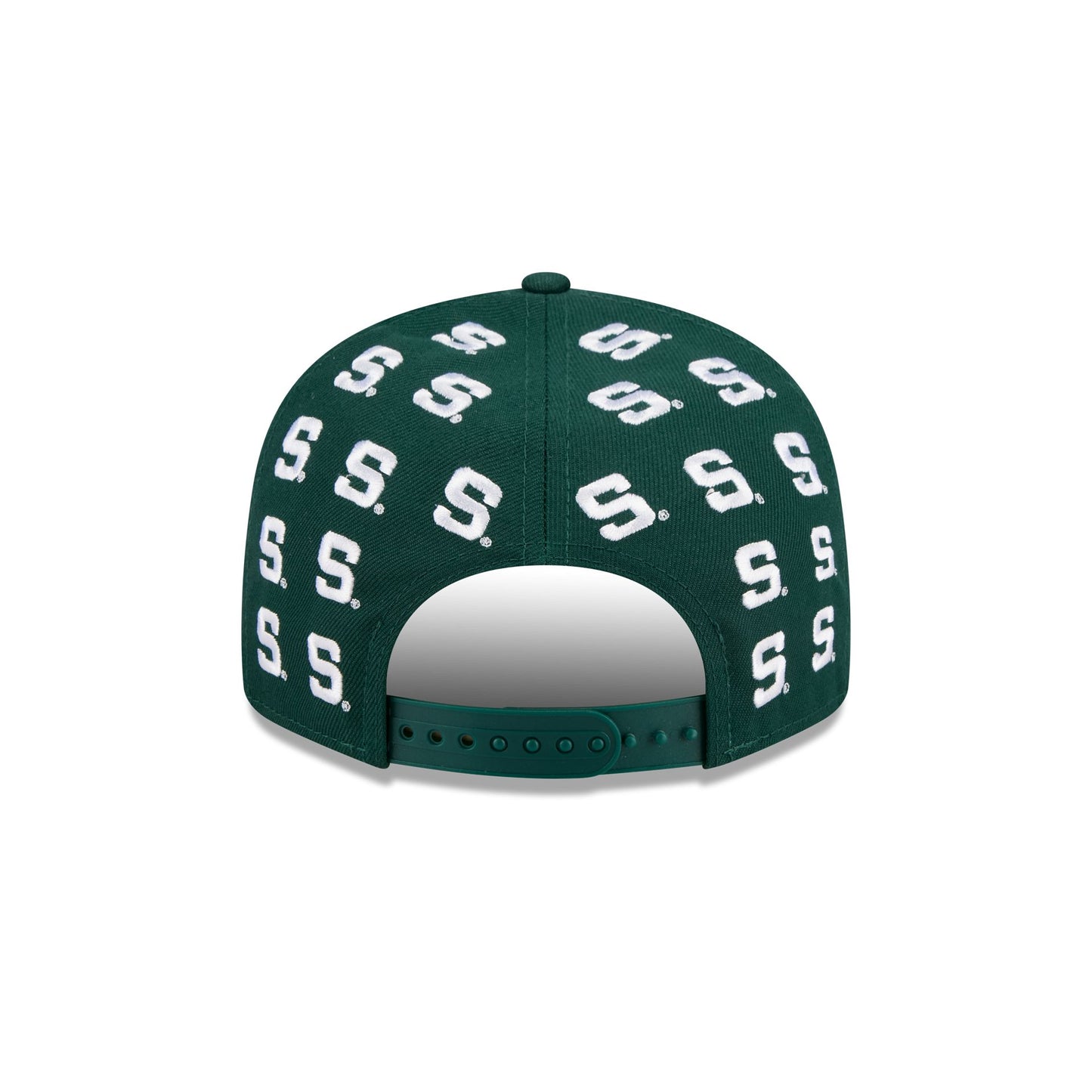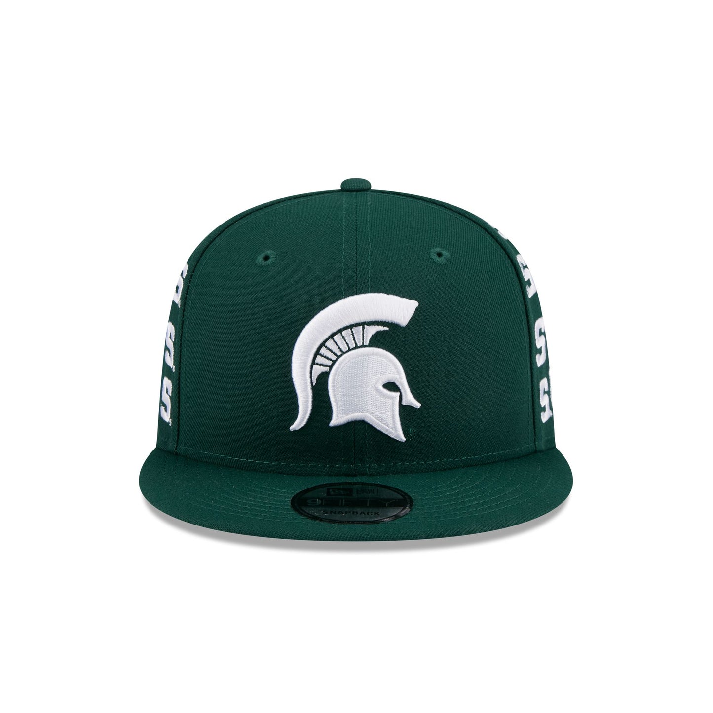 The Michigan State Spartans Sticker Helmet 9FIFTY Snapback features an embroidered Spartans logo at the front panels with embroidered team stickers the back panels. Additional details include an adjustable snapback closure at the rear and a gray undervisor.