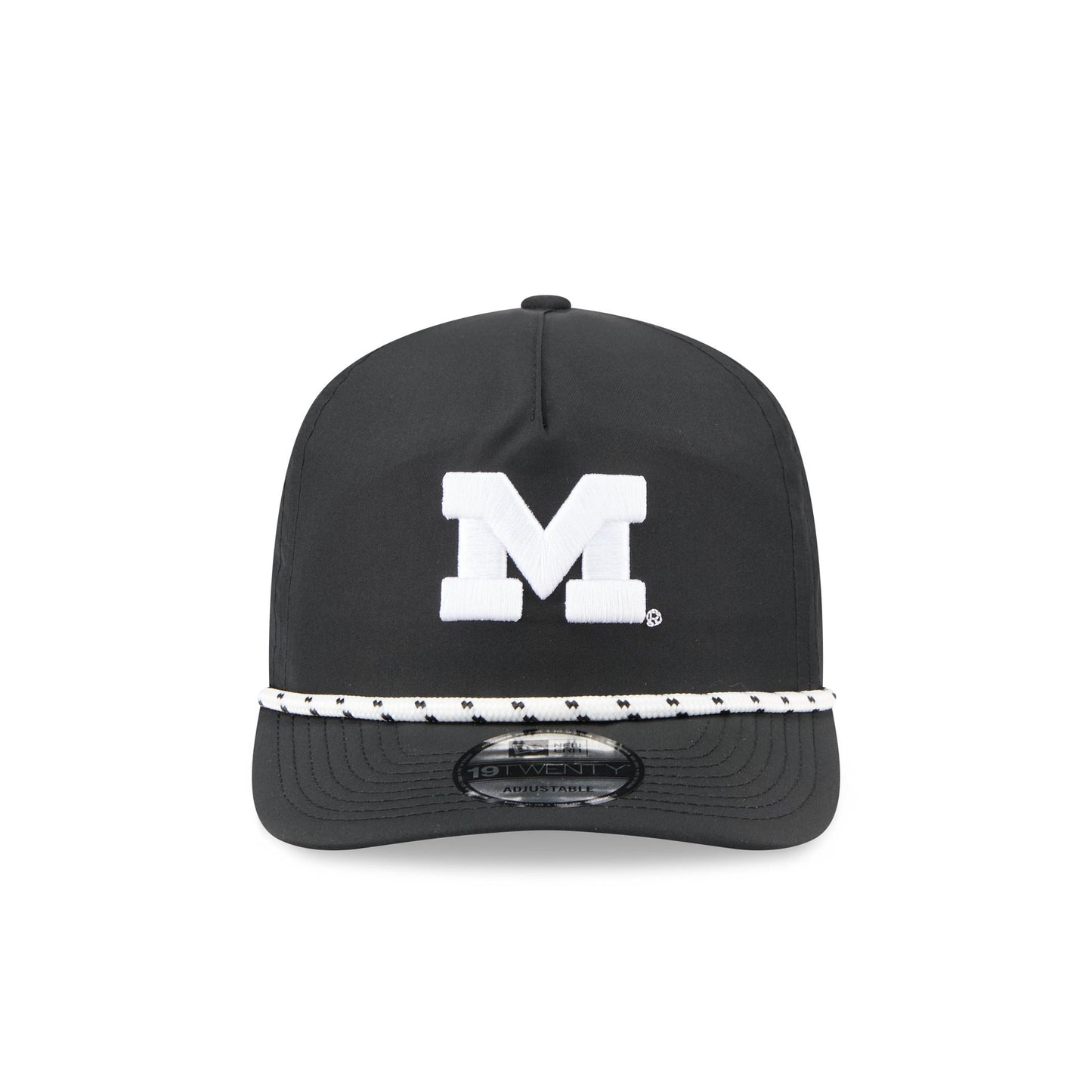 The Michigan Wolverines Black and White Rope 19TWENTY Snapback features an embroidered Wolverines logo and rope at the front with a snapback closure at the rear and a gray undervisor.