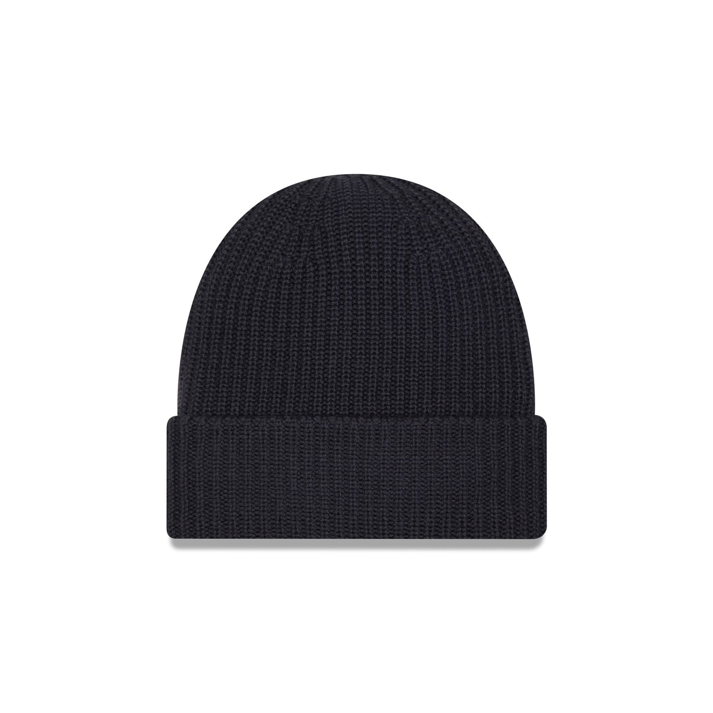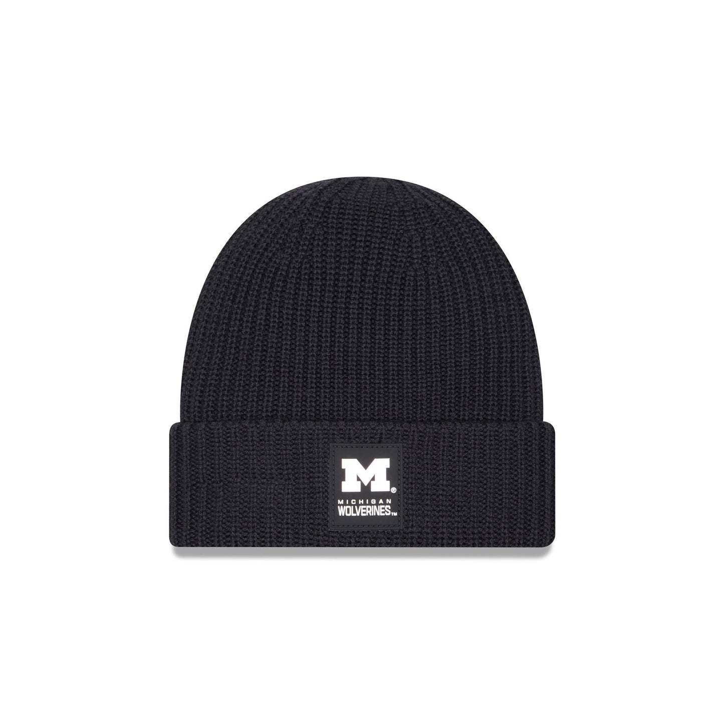The Michigan Wolverines Cold Weather Cuff Knit features a sewn-down silicone Wolverines logo patch at the front cuff with an embroidered New Era Flag at the left-wear side. The cuff knit features a wool yarn fabrication with a fleece lining.