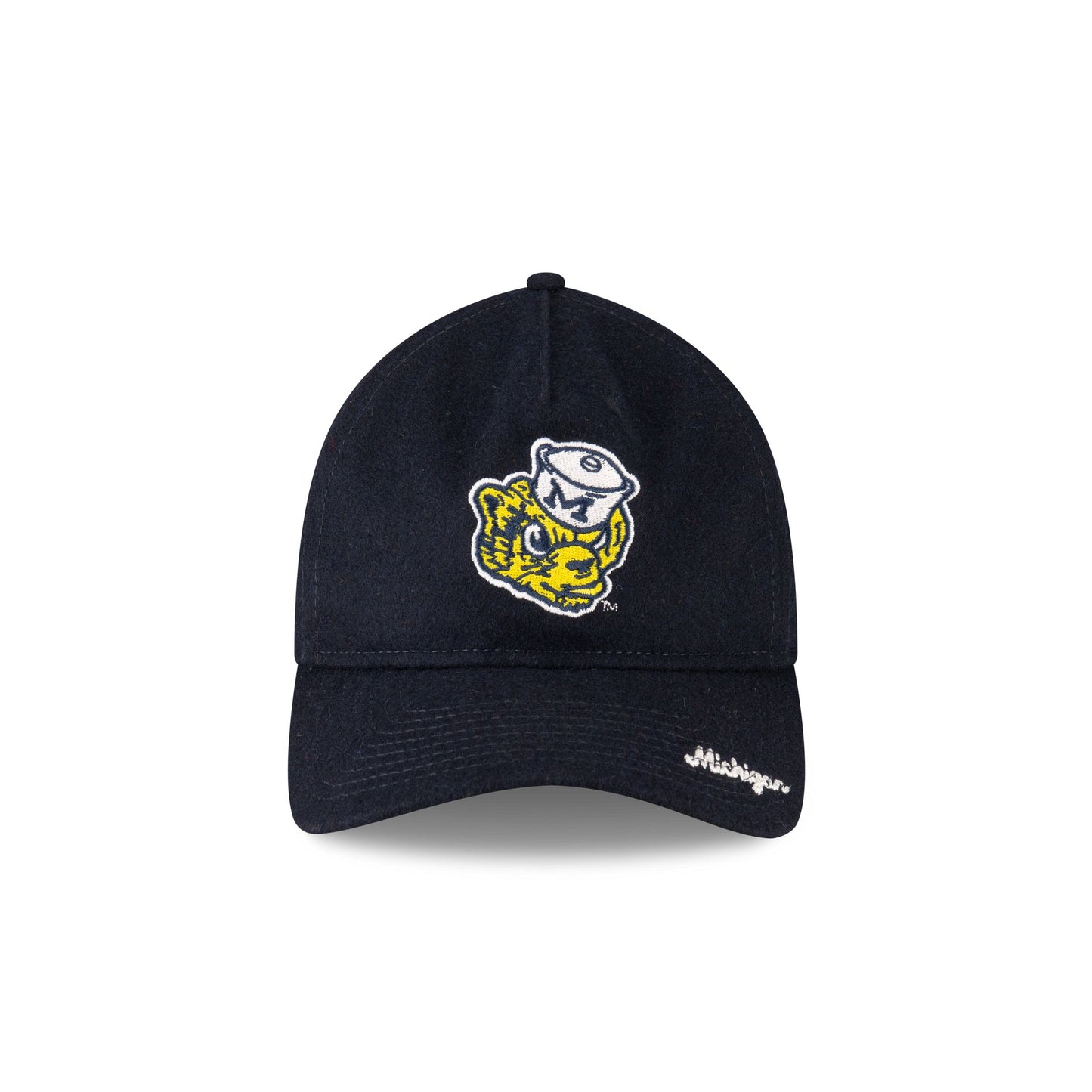 The Michigan Wolverines College Vault Wool Letterman 9TWENTY A-Frame Adjustable Cap features an embroidered Wolverines College Vault logo at the front panels against a wool fabrication throughout the cap. Additional details include an embroidered team script at the visor with a striped adjustable D-Ring closure at the rear and a green undervisor.