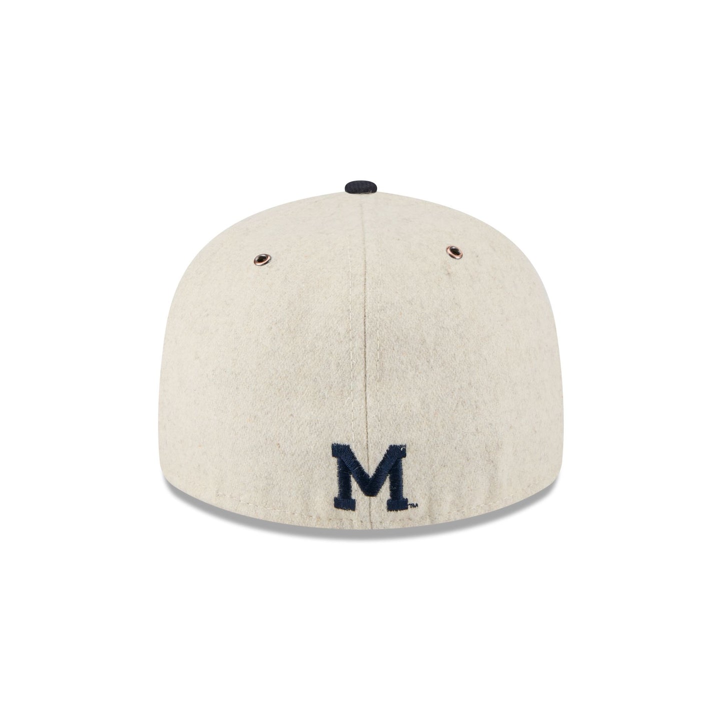 The Michigan Wolverines College Vault Wool Letterman Retro Crown 59FIFTY Fitted Cap features an embroidered loop Wolverines College Vault logo at the front panels and an additional logo at the rear. Additional details include a wool fabrication throughout the cap and a gray undervisor.