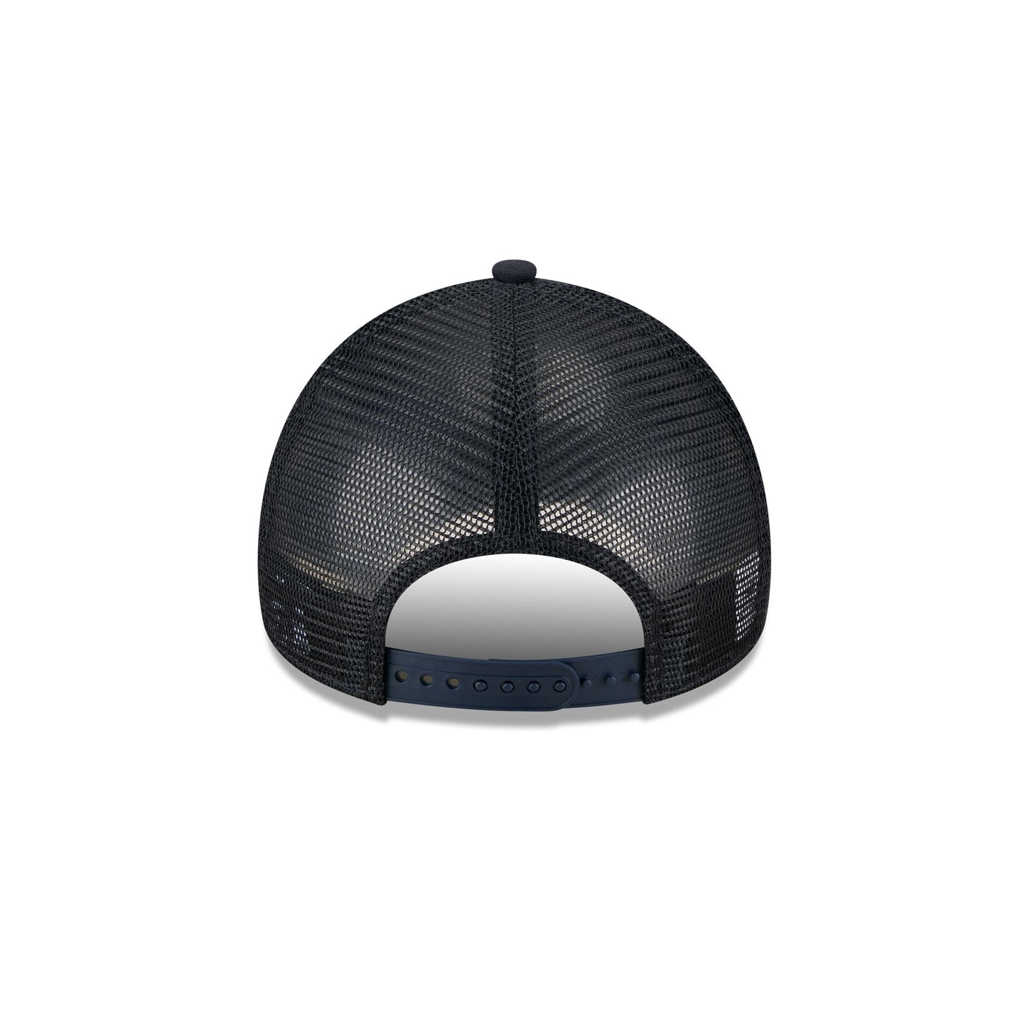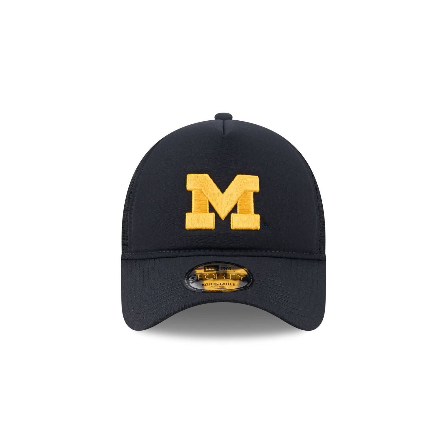 The Michigan Wolverines Go-To 9FORTY A-Frame Trucker features an embroidered Wolverines logo at the front panels with a snapback closure at a mesh rear.