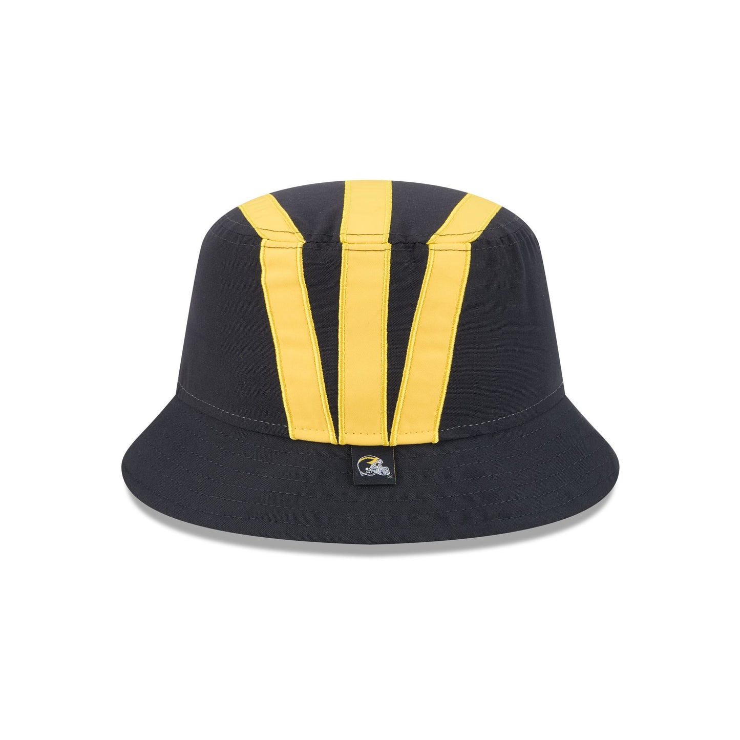 The Michigan Wolverines Helmet Bucket Hat features an embroidered Wolverines helmet design throughout.