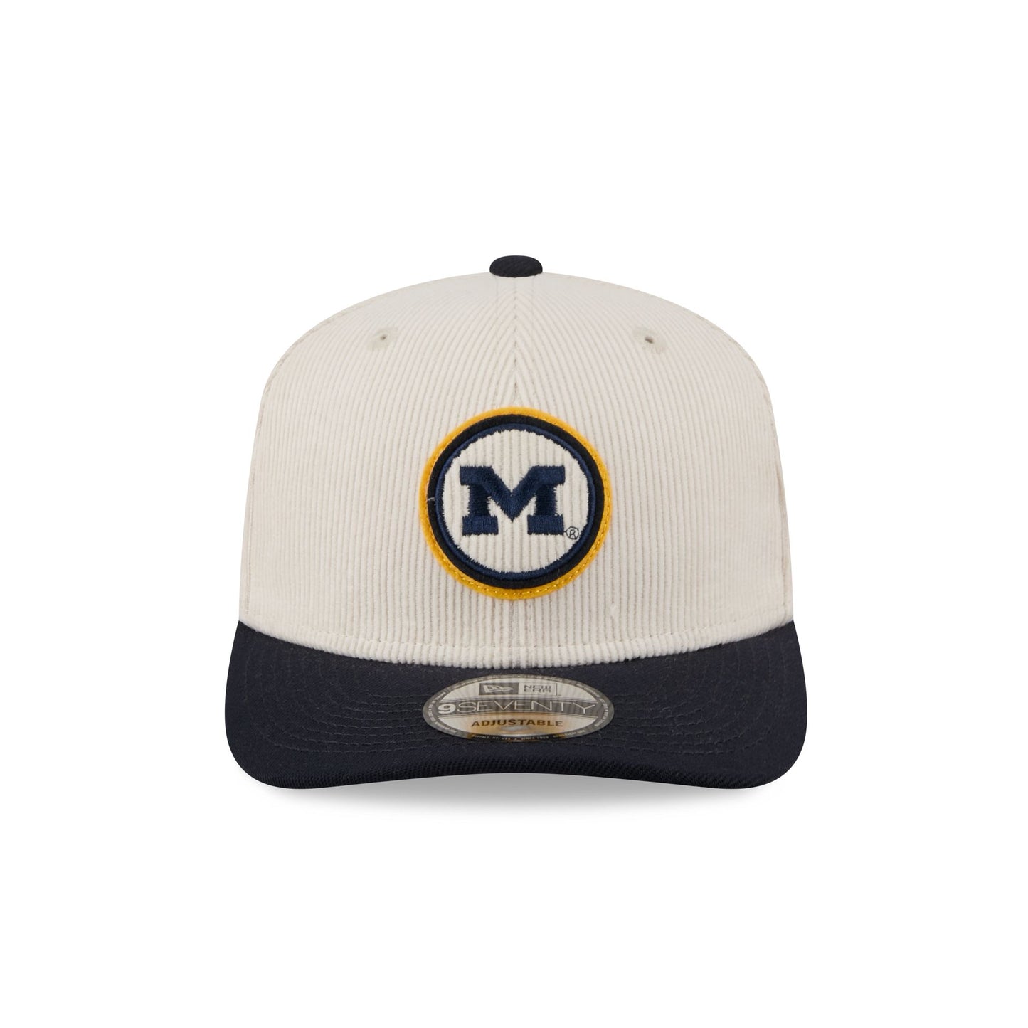 The Michigan Wolverines Loyal Corduroy 9SEVENTY Stretch-Snap features an embroidered Wolverines logo at the front panels against a corduroy fabrication throughout the cap. Additional details include an alternate logo at the right-wear side with an adjustable stretch-snap closure at the rear.