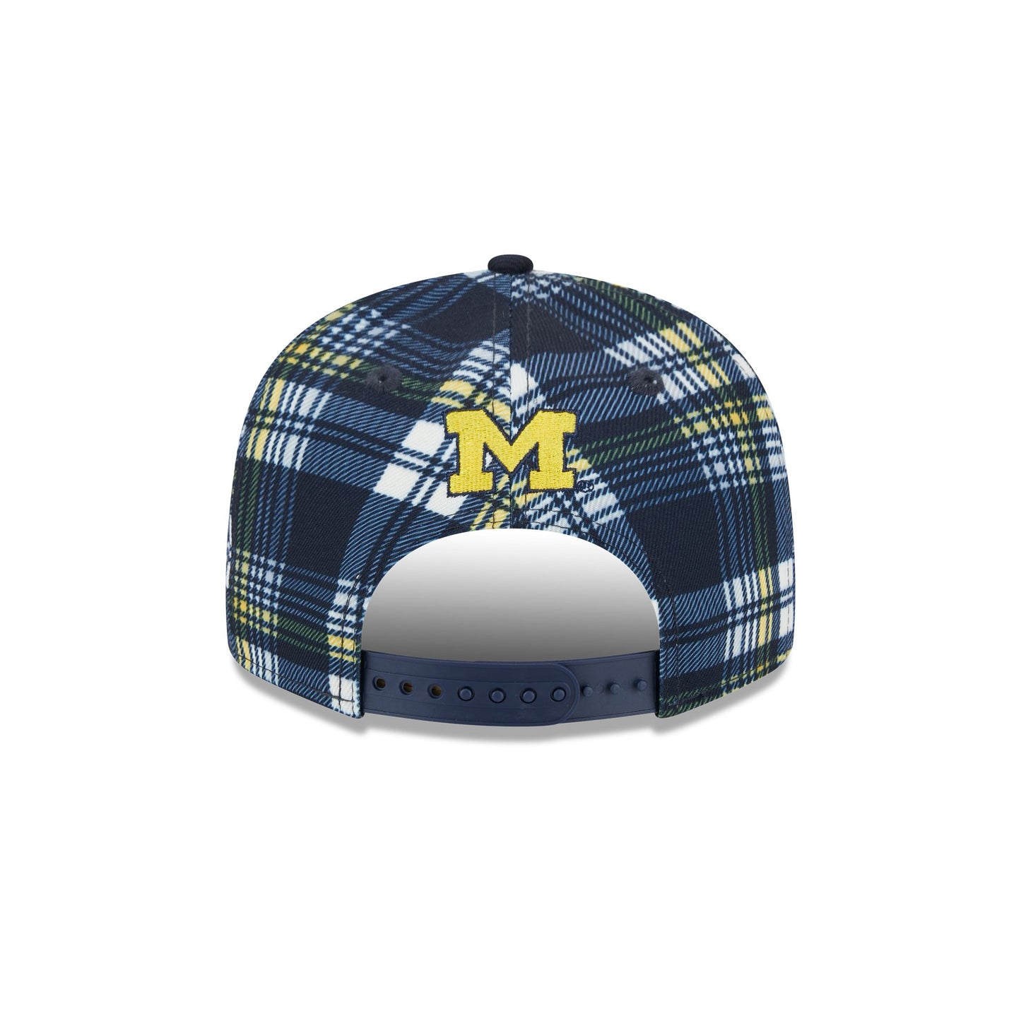 The Michigan Wolverines Plaid 9FIFTY Snapback features an embroidered Wolverines logo at the front panels against a matching plaid pattern. Additional details include a team logo above a snapback closure at the rear and a gray undervisor.