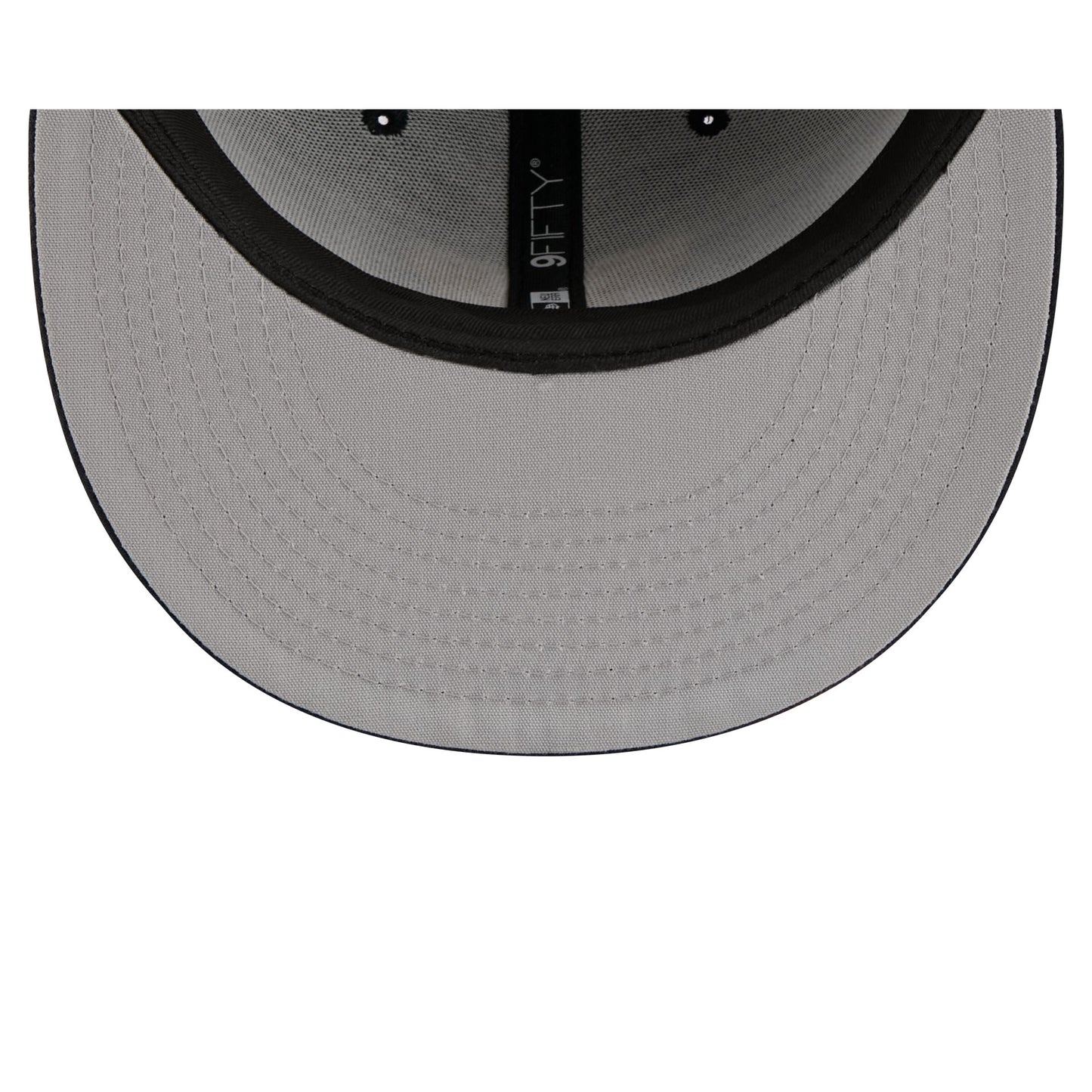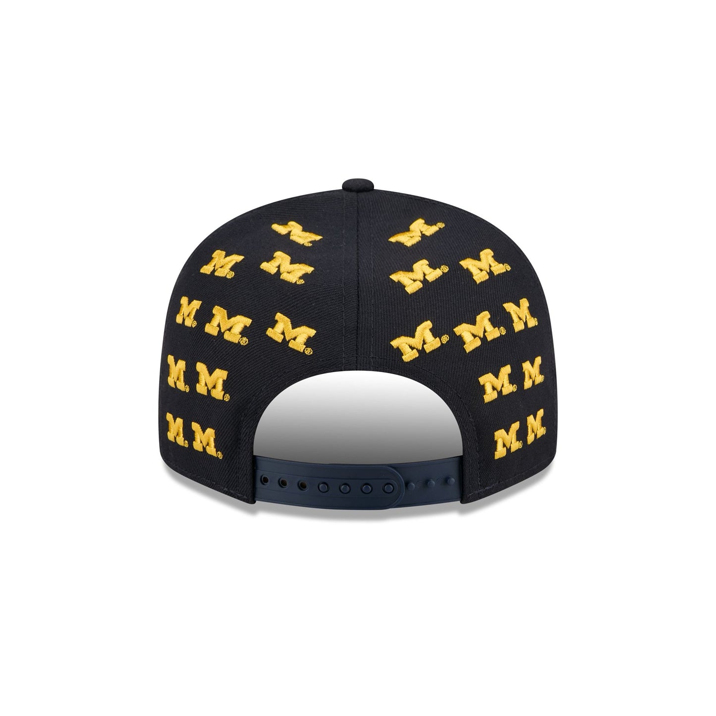 The Michigan Wolverines Sticker Helmet 9FIFTY Snapback features an embroidered Wolverines logo at the front panels with embroidered team stickers the back panels. Additional details include an adjustable snapback closure at the rear and a gray undervisor.