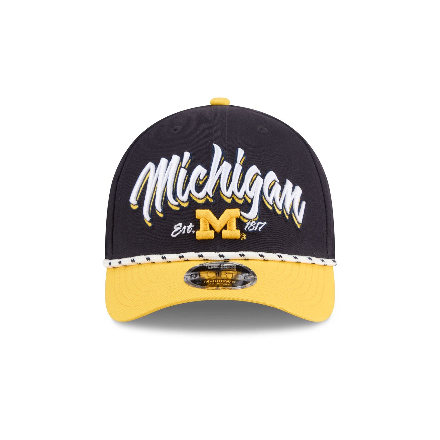 The Michigan Wolverines Team Loyal 9FORTY M-Crown Snapback features an embroidered Wolverines wordmark graphic at the front panels with a rope at the visor. Additional details include an adjustable snapback closure at the rear and a gray undervisor.