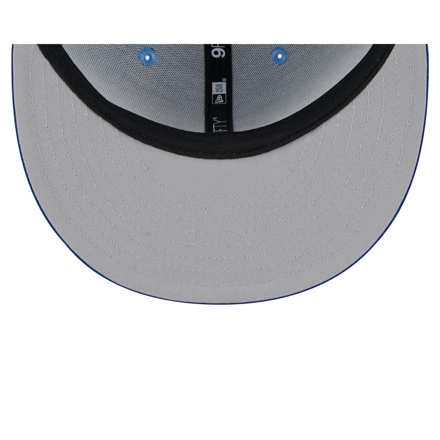 The Milwaukee Brewers 2025 Batting Practice 9FIFTY Snapback features an embroidered Brewers logo at the front panels with a matching snapback closure at the rear. Additional details include a pivot knit fabrication, a blue visor, and a gray undervisor.