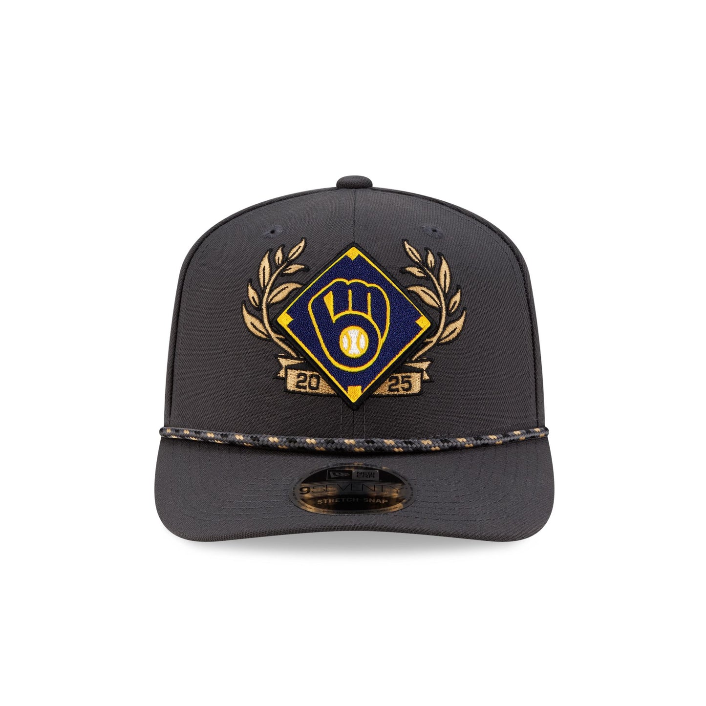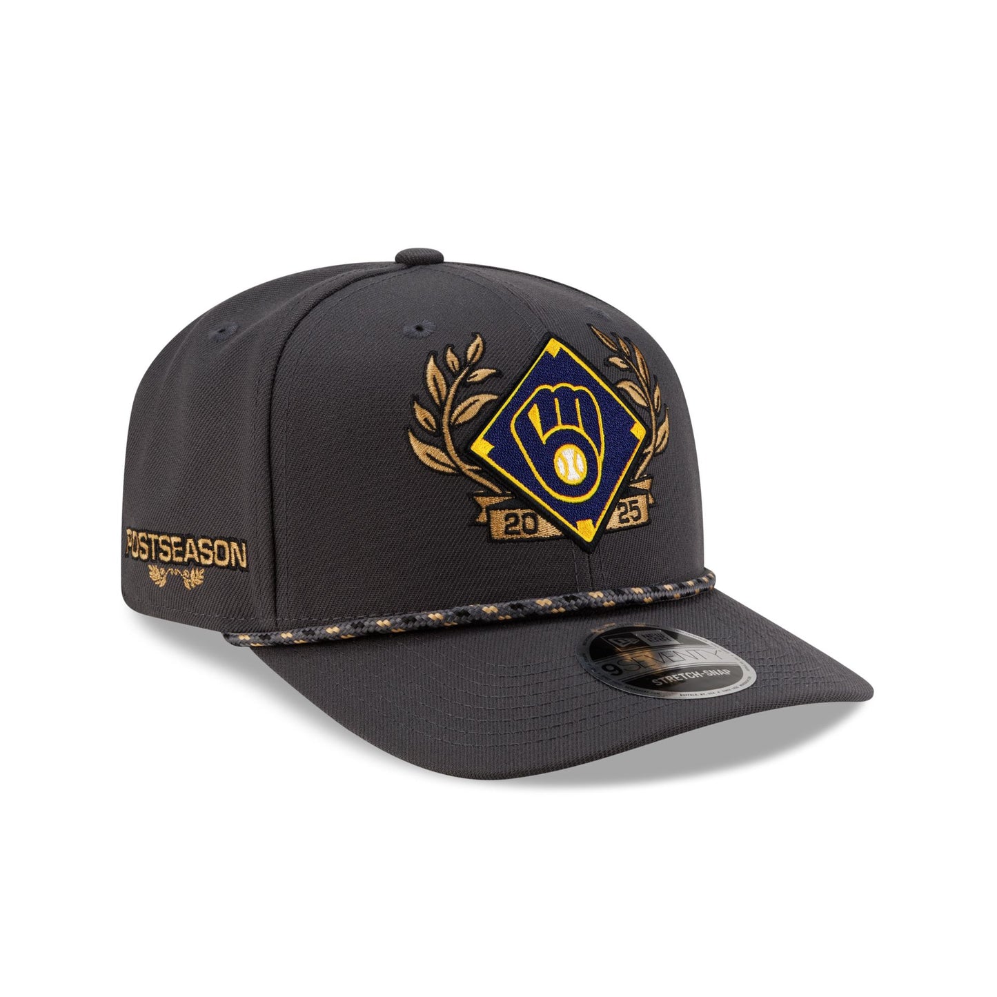The Milwaukee Brewers 2025 NLDS Locker Room 9SEVENTY Stretch-Snap Cap features an embroidered Brewers logo with gold leaf accents at the front panels with a Postseason patch at the right-wear side. Additional details include a rope at the visor and the MLB Batterman logo above an adjustable stretch-snap closure at the rear.